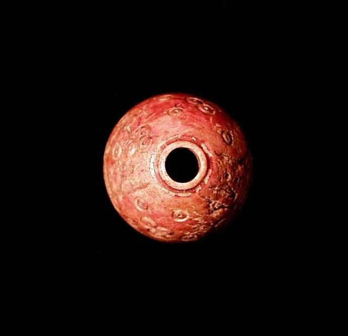 Close-up of a spherical clay bead in brick red with all-over raised circular loop motifs and a central perforation, against a black background