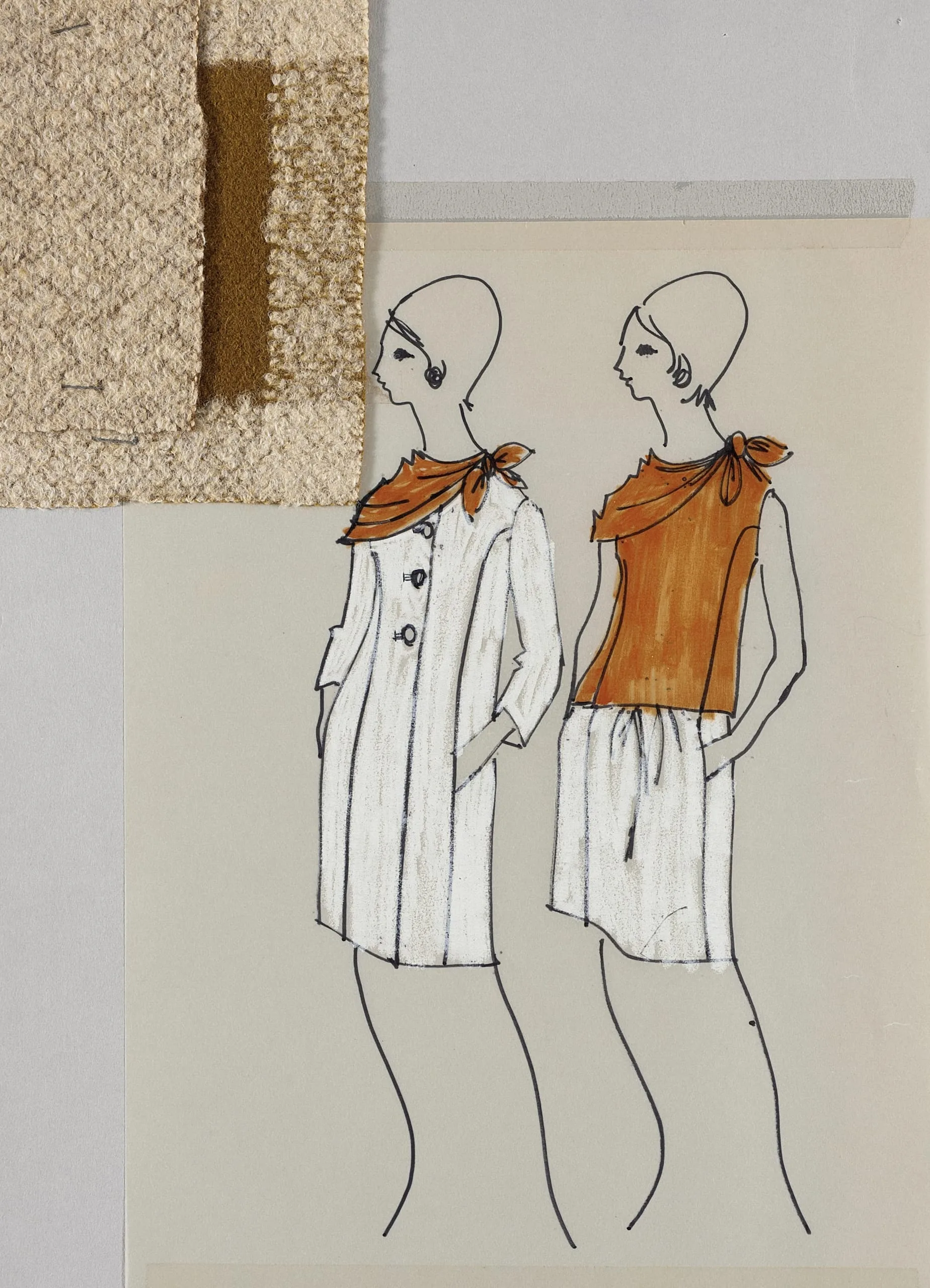 - Ink on vellum mounted on cardboard matte with cloth swatch