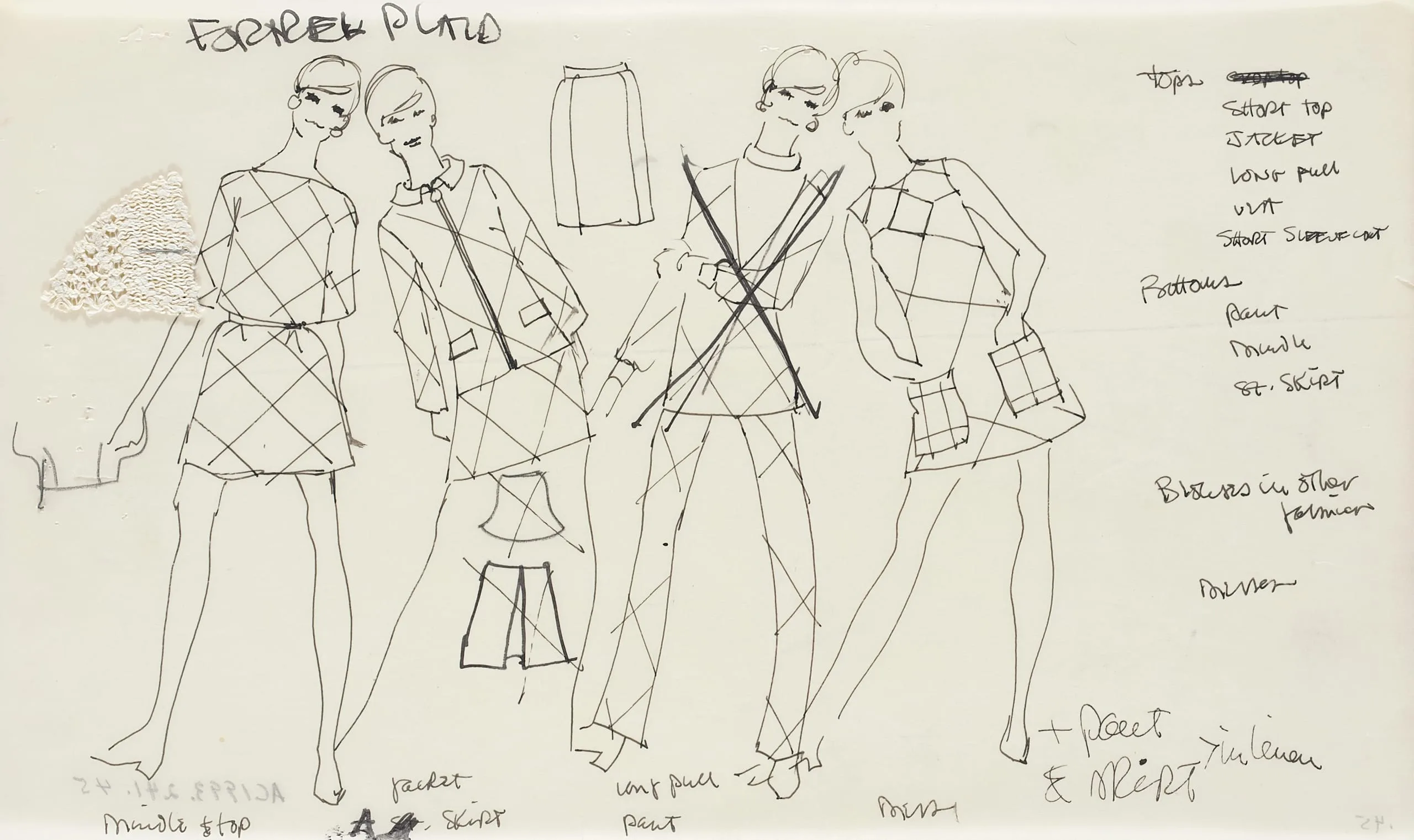 Fashion illustration in black ink on cream paper showing four elongated female figures and isolated garment sketches in a plaid theme, with handwritten design notes throughout