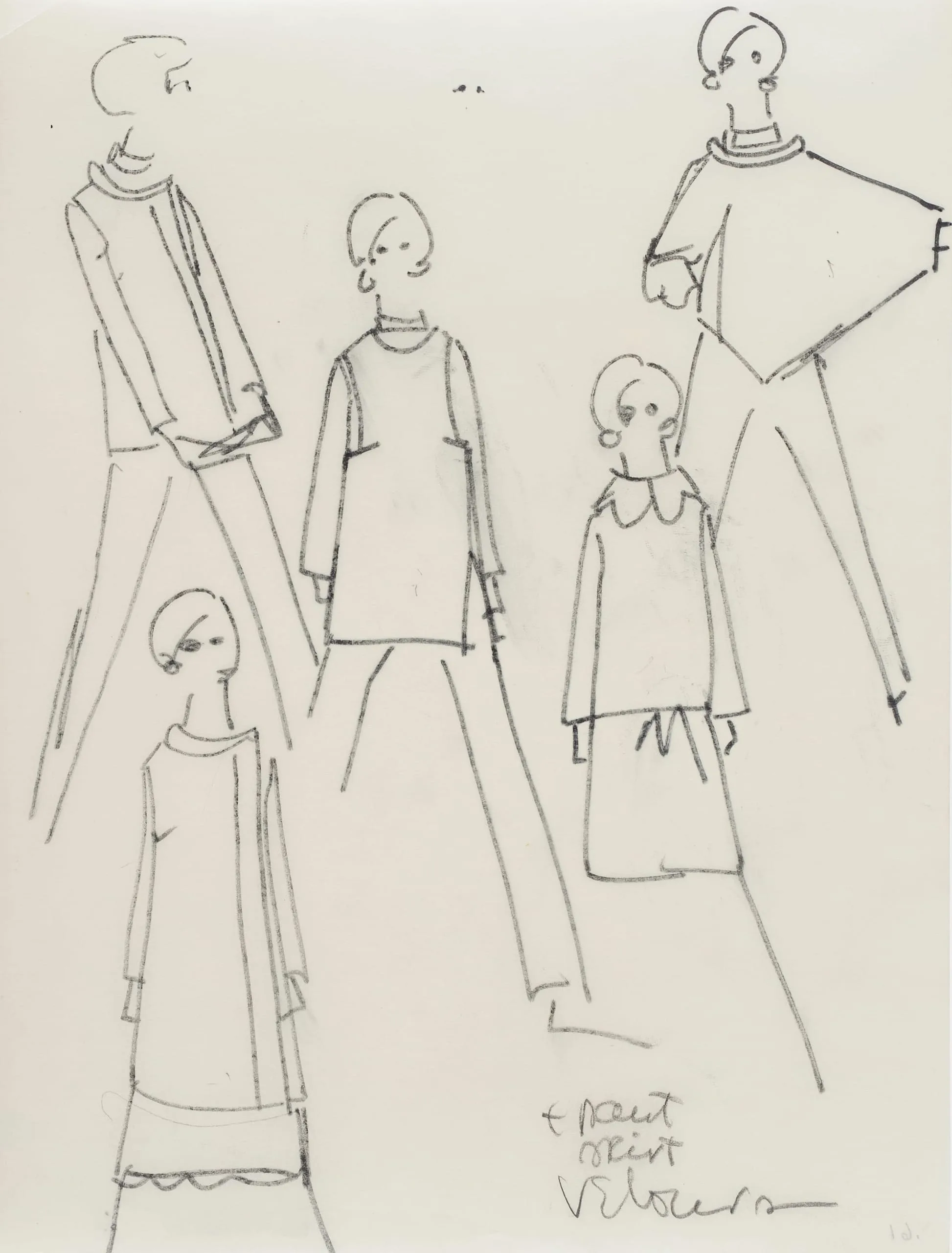 Graphite fashion sketch on off-white paper showing five stylized figures in loose, gestural lines, wearing tunics, capes, and long dresses, with handwritten annotations in the lower right