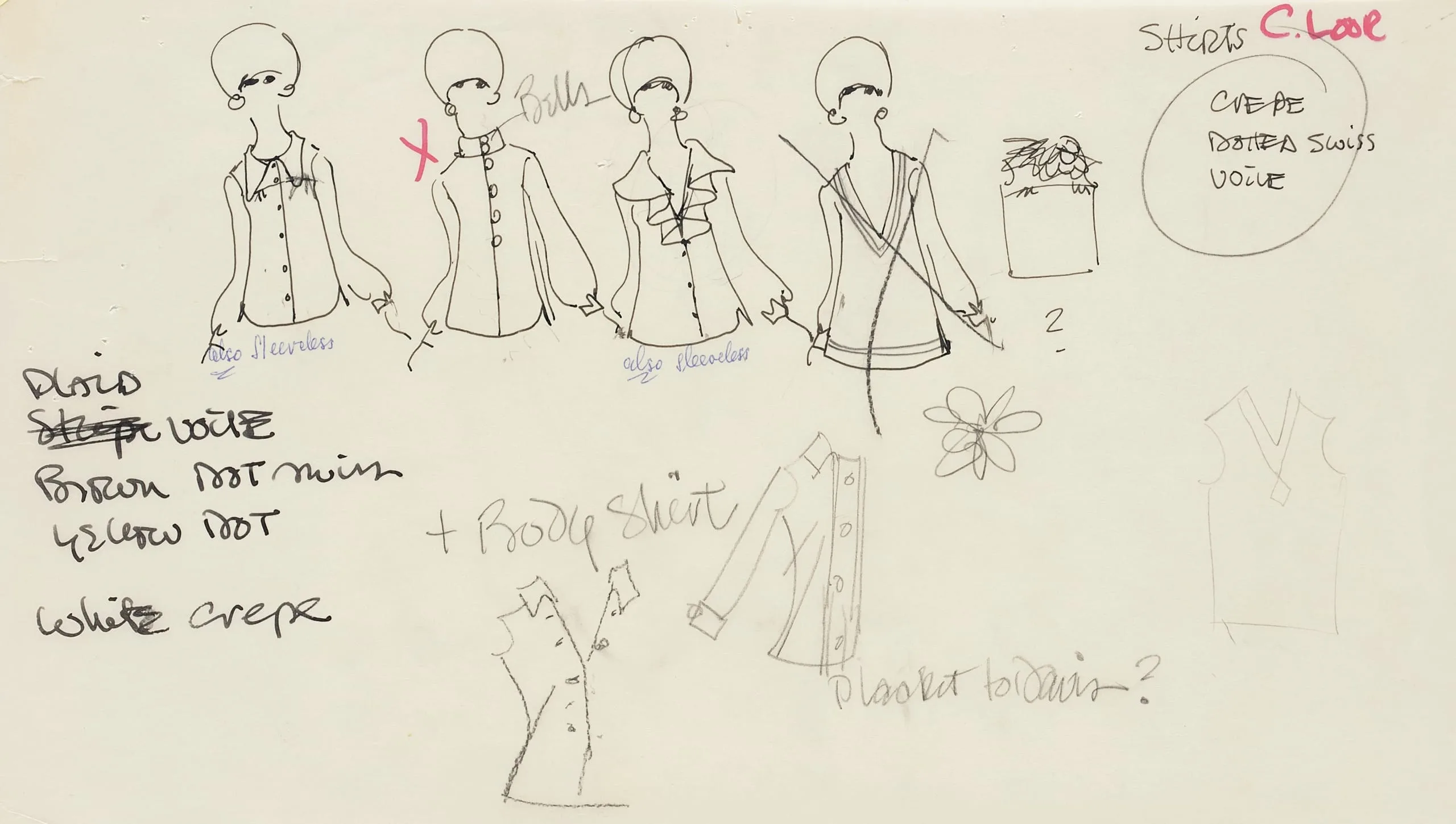 Pencil and red ink fashion design sheet on cream paper with four gestural figure sketches wearing blouses and trousers, accompanied by fabric notes and detail drawings