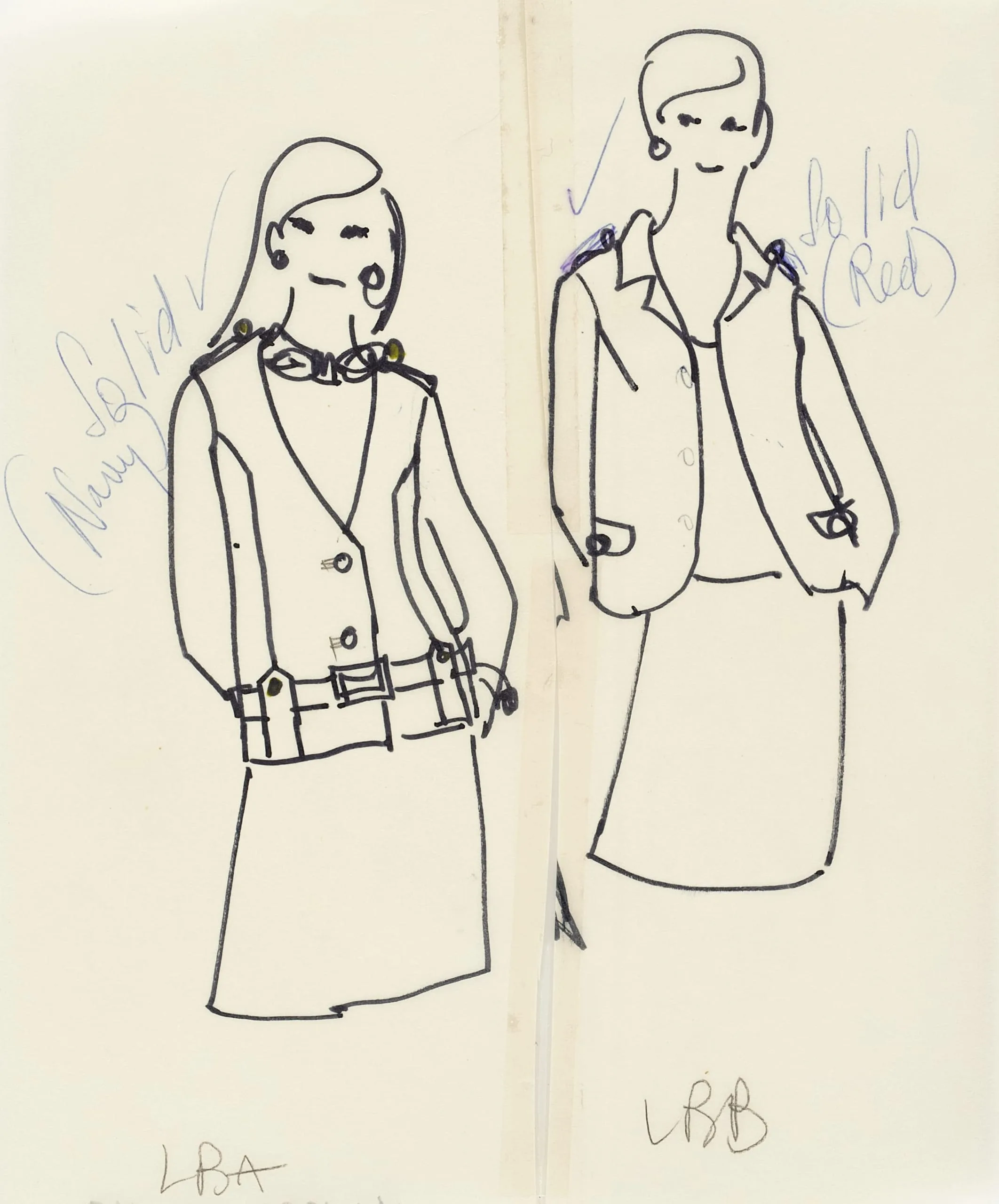 Fashion design drawing in black ink on cream paper, two female figures in coat and suit outfits, with handwritten color notes in blue ink