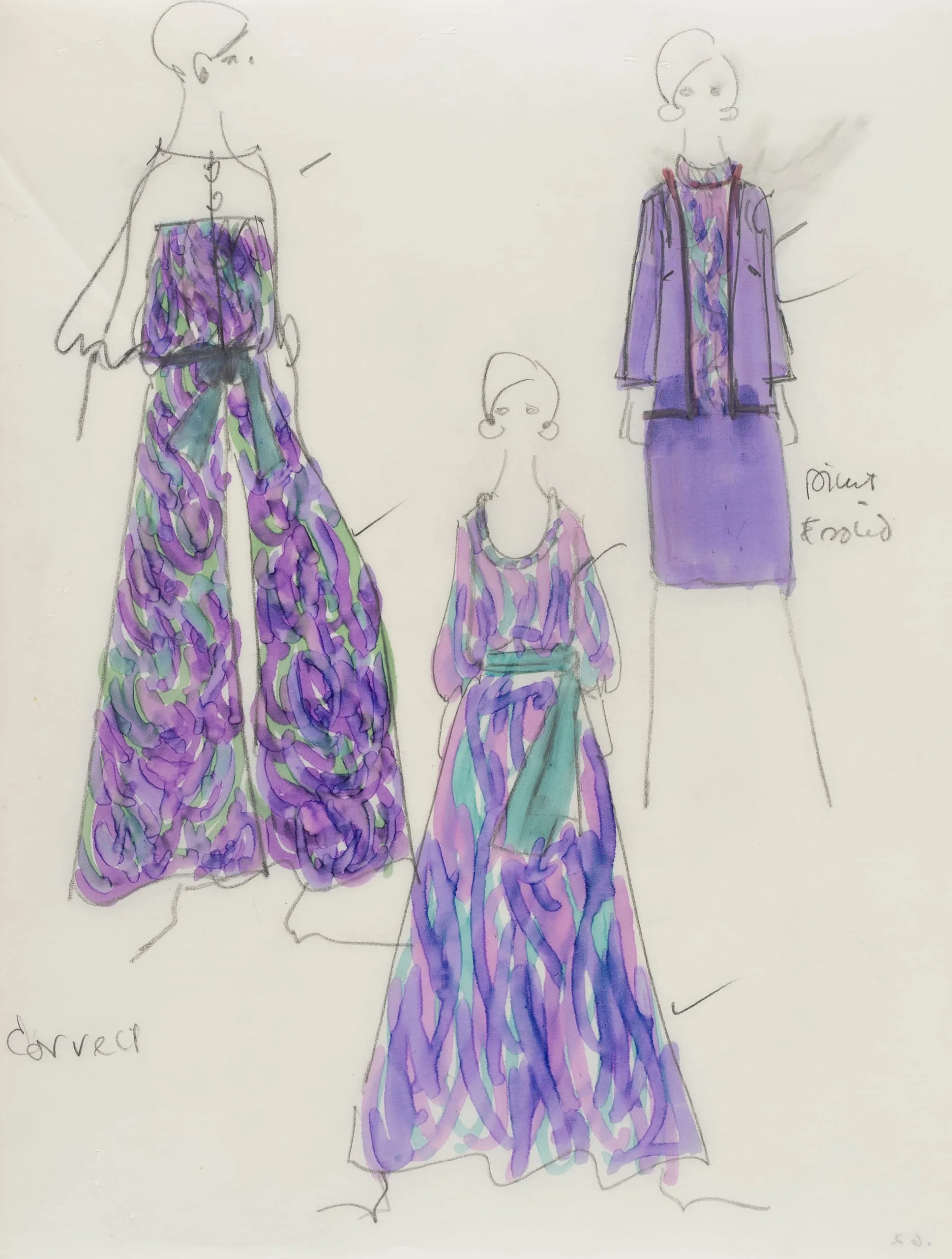 Fashion illustration drawing in pencil and watercolor showing three elongated figures in purple, teal, and pink patterned garments, with handwritten annotations