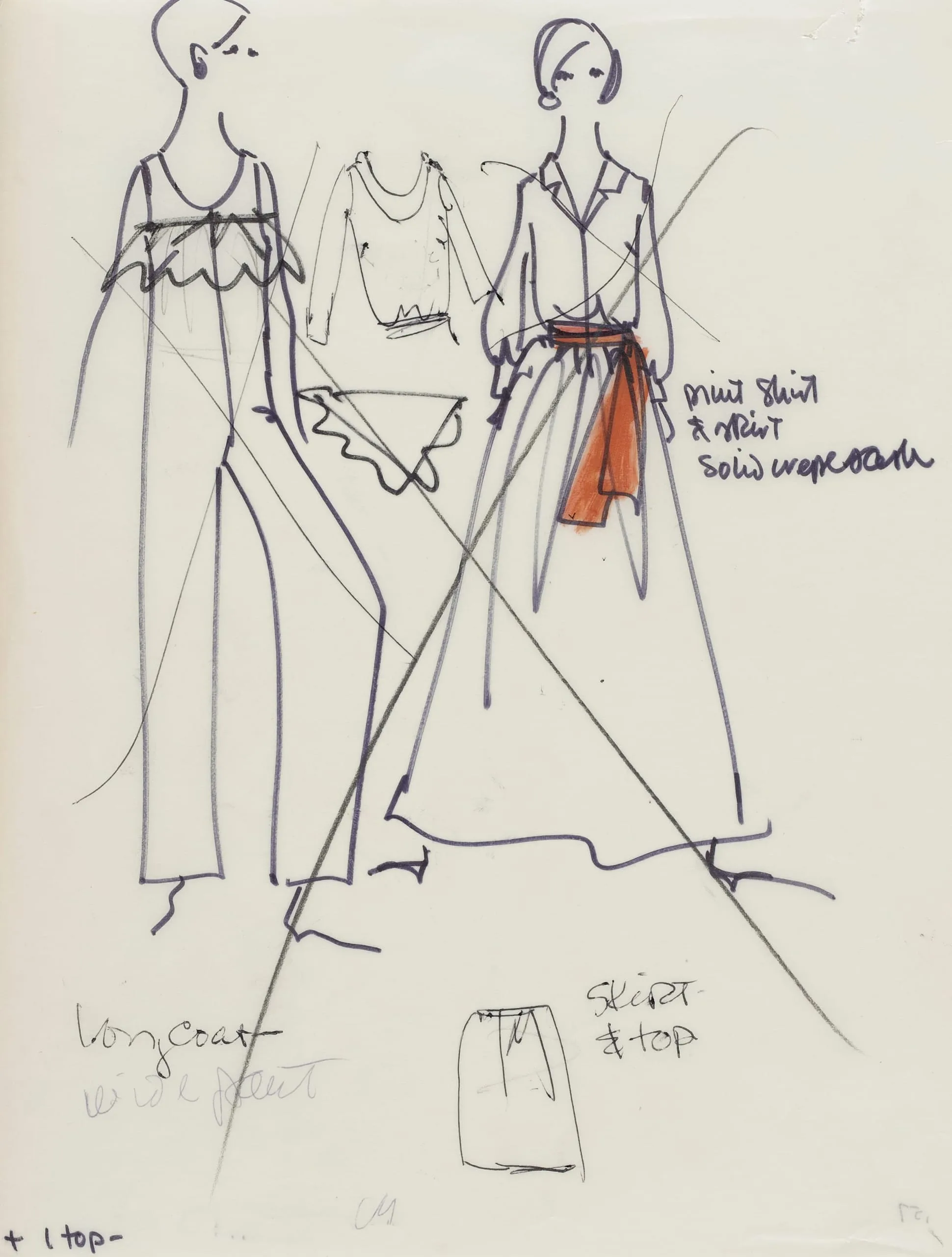 Fashion design sketch in dark ink on off-white paper, two elongated figures in floor-length garments with handwritten annotations, one detail in burnt orange at the waist