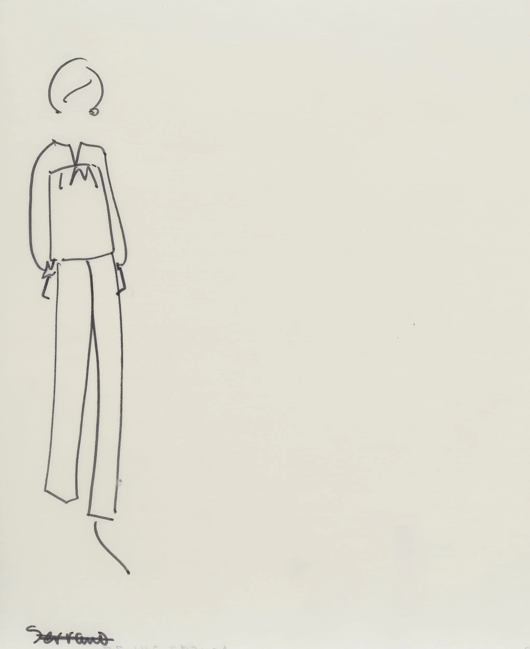 Fashion illustration in black ink on off-white paper, minimal line drawing of a standing figure in profile wearing a loose top and wide-leg trousers