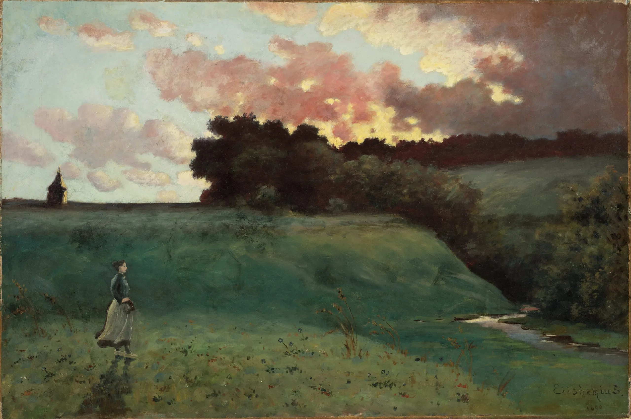 Eilshemius painted the clouds in shades of pink, lavender, and gold to form a brilliant foil for the somber greens and blues of the foreground and distant trees. Eilshemius also constructed his composition as INNESS so often did by composing it around an expansive, open field in a settled area of the countryside. While Eilshemius captured the dramatic poetry of INNESS, he avoided the hazy atmosphere of Inness’s late paintings.