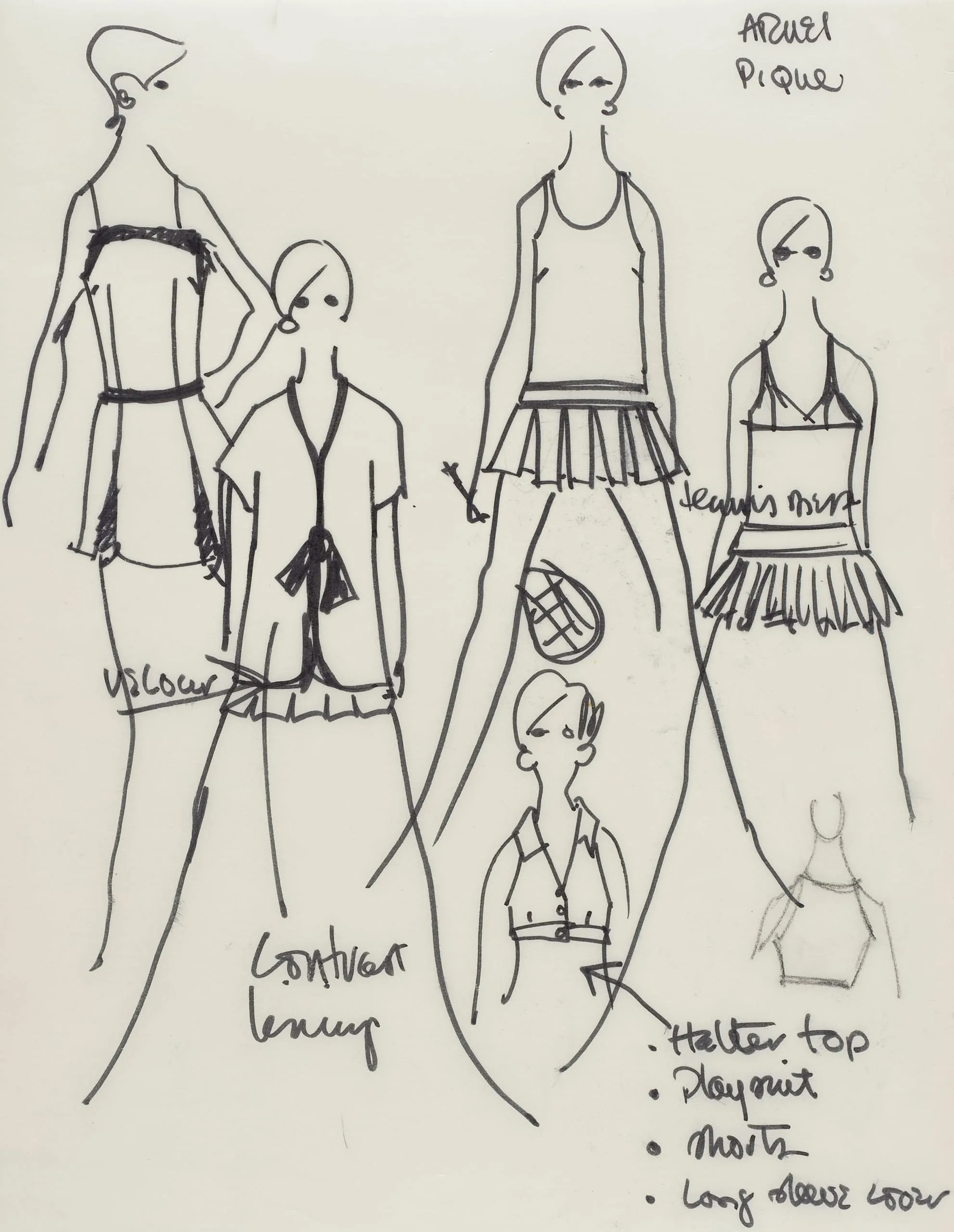 Ink fashion design sketches on off-white paper showing six stylized figures in halter tops, blazers, pleated miniskirts, and ruffled skirts, with handwritten annotations
