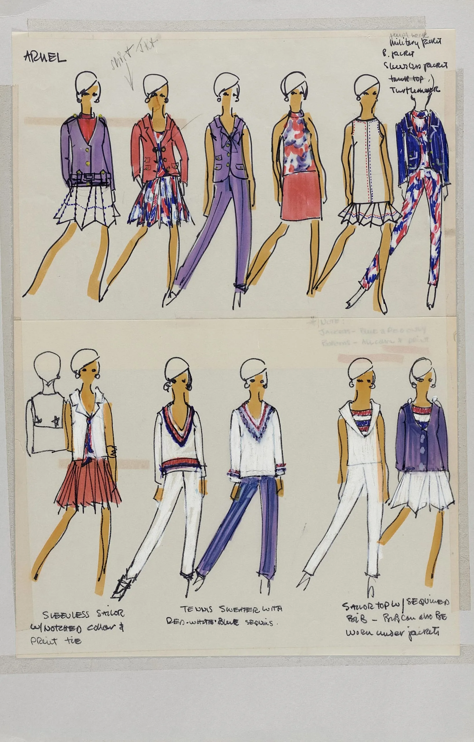 Fashion illustration in ink and watercolor on cream paper, two rows of elongated stylized figures in coordinated red, white, and purple outfits with handwritten annotations