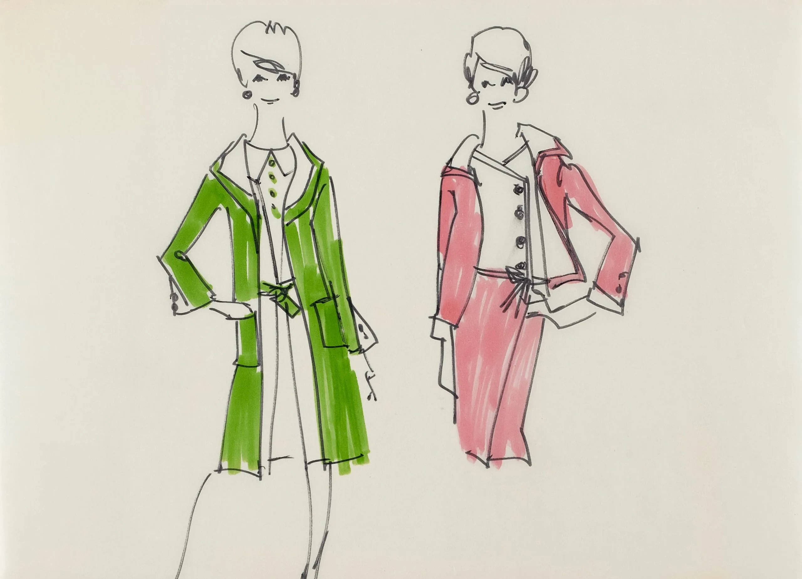 Fashion illustration in black ink and colored marker on cream paper, two elongated female figures in a green open coat and a rose-pink jacket-and-skirt suit