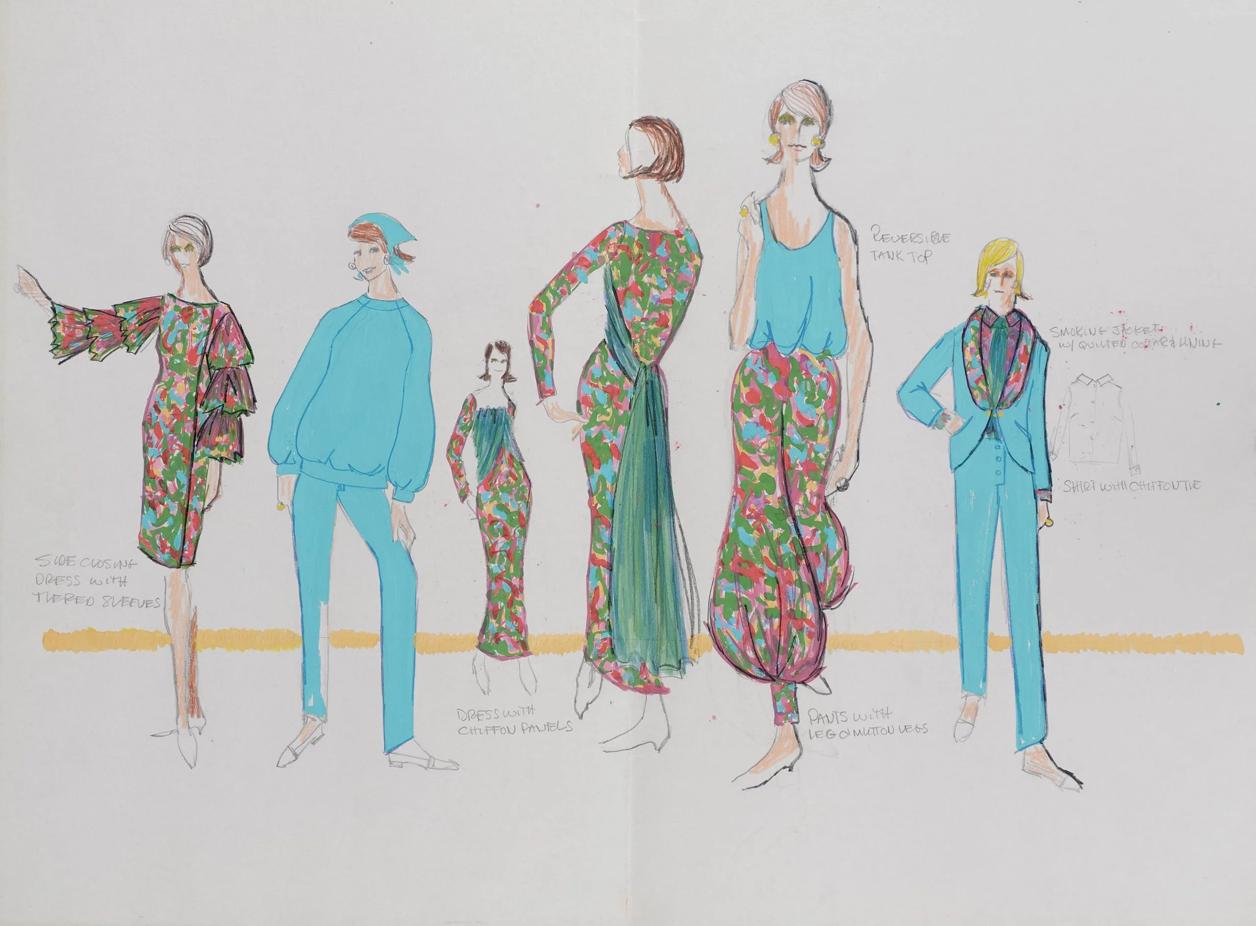 Fashion illustration in marker and pencil on off-white paper, showing six stylized figures wearing turquoise and multicolored floral outfits, with handwritten garment labels