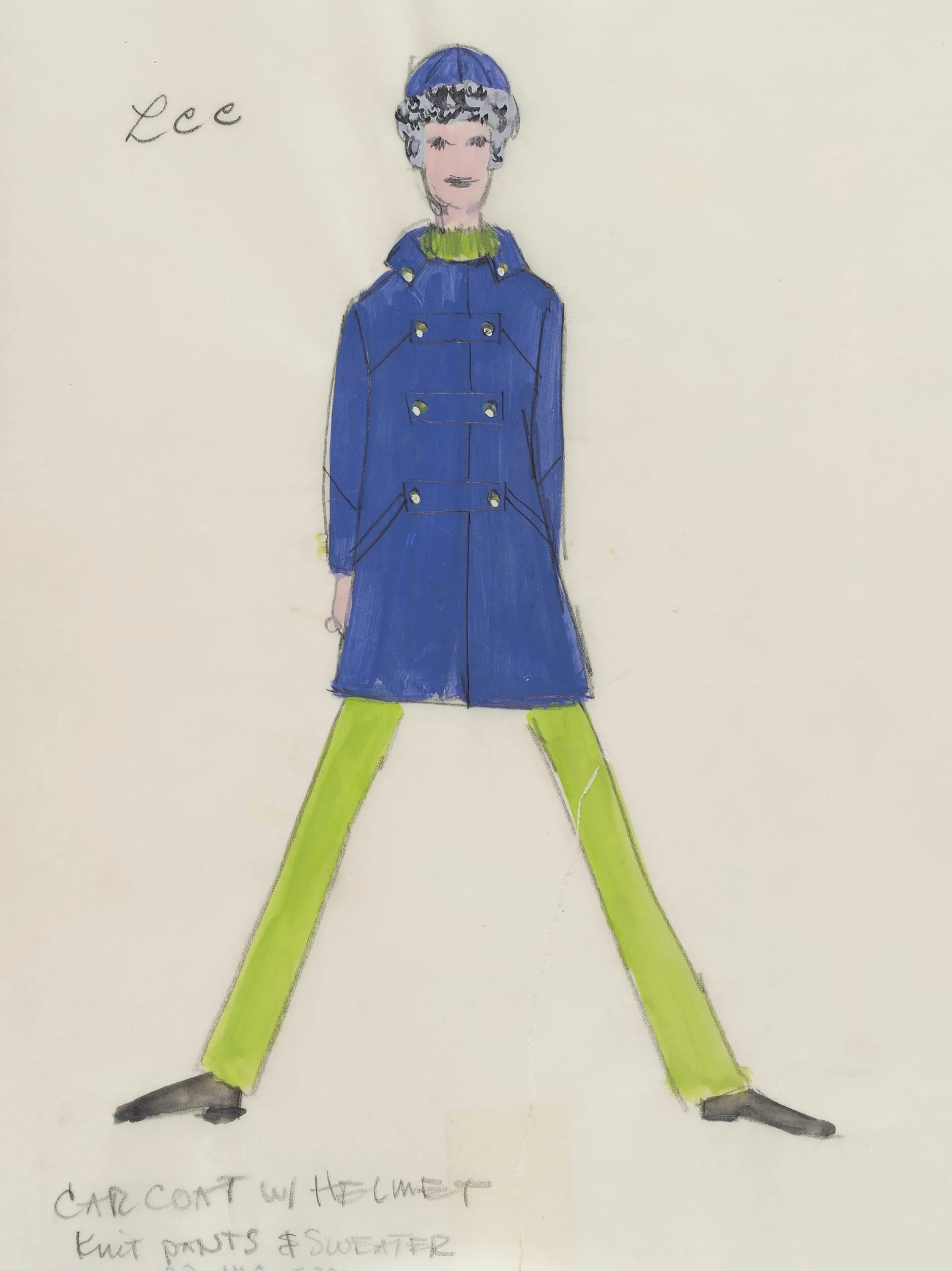 Costume design drawing in gouache and pencil, full-length figure in cobalt blue double-breasted coat, chartreuse pants, and blue helmet hat, with handwritten annotations