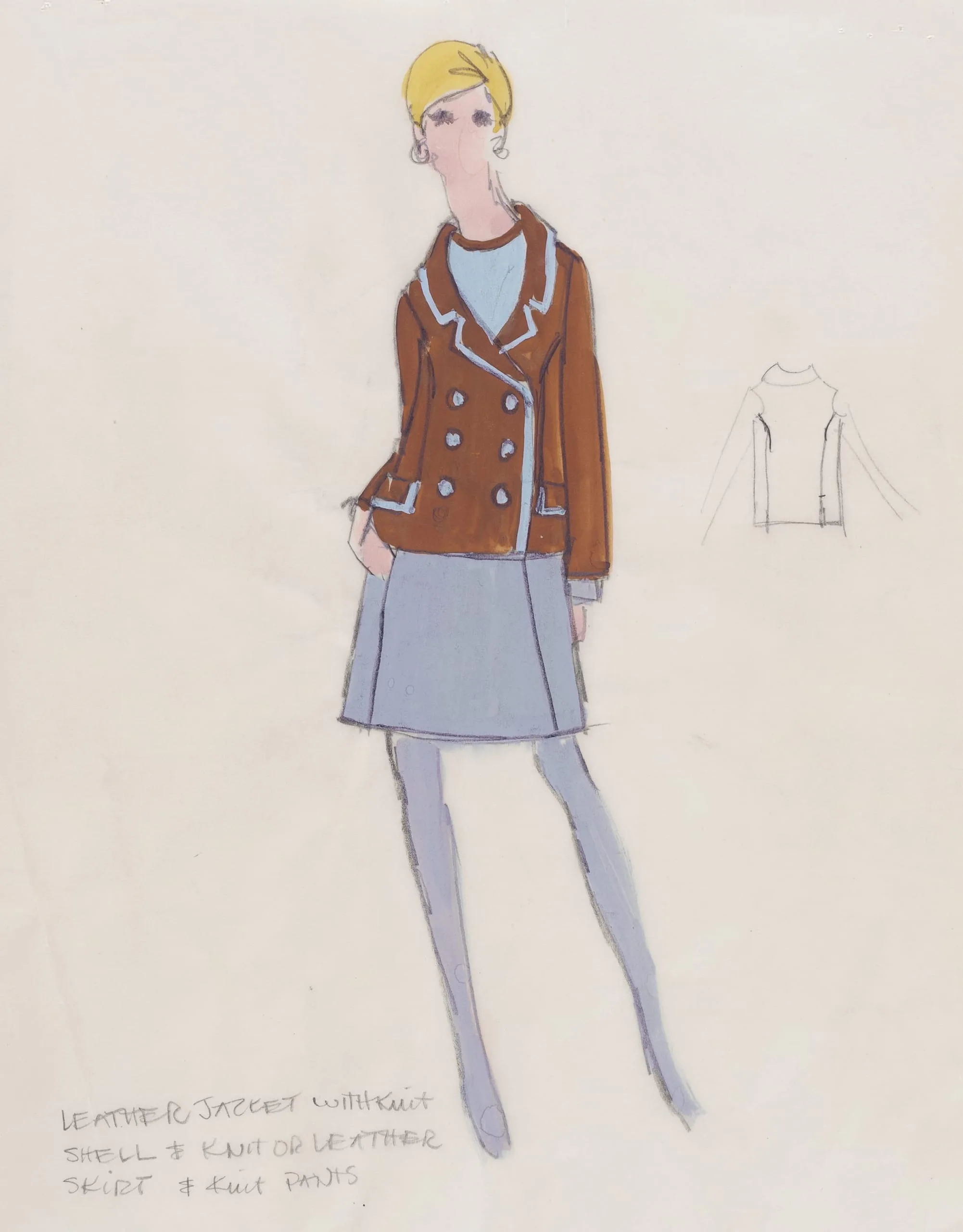 Fashion illustration in marker and colored pencil on cream paper, full-length female figure in a rust-brown double-breasted jacket with blue trim, periwinkle skirt, and yellow hair, with a pencil detail sketch of a turtleneck at right