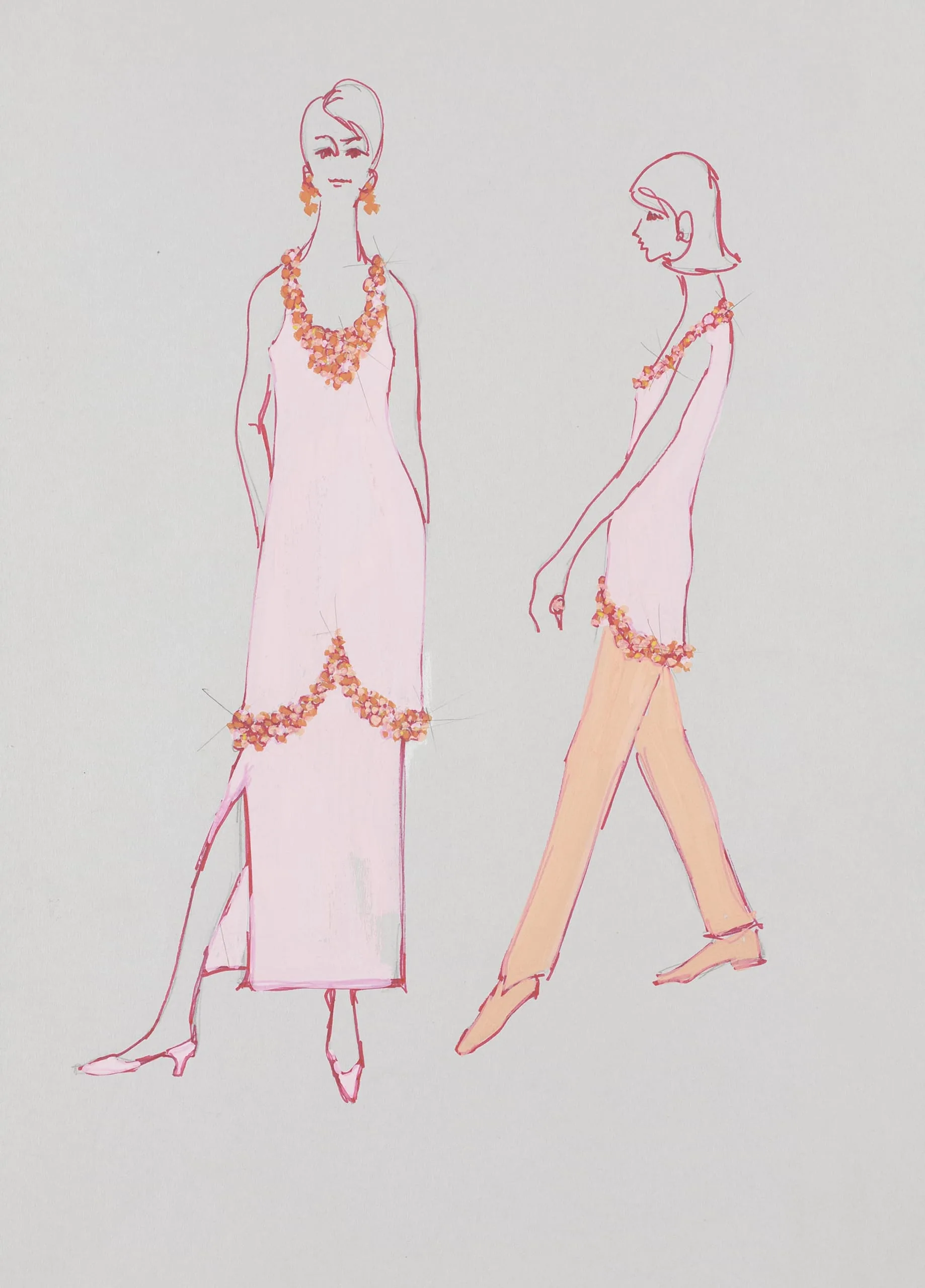 Fashion illustration in pink and coral ink on gray paper, showing two female figures in front and profile views wearing floral-trimmed halter garments