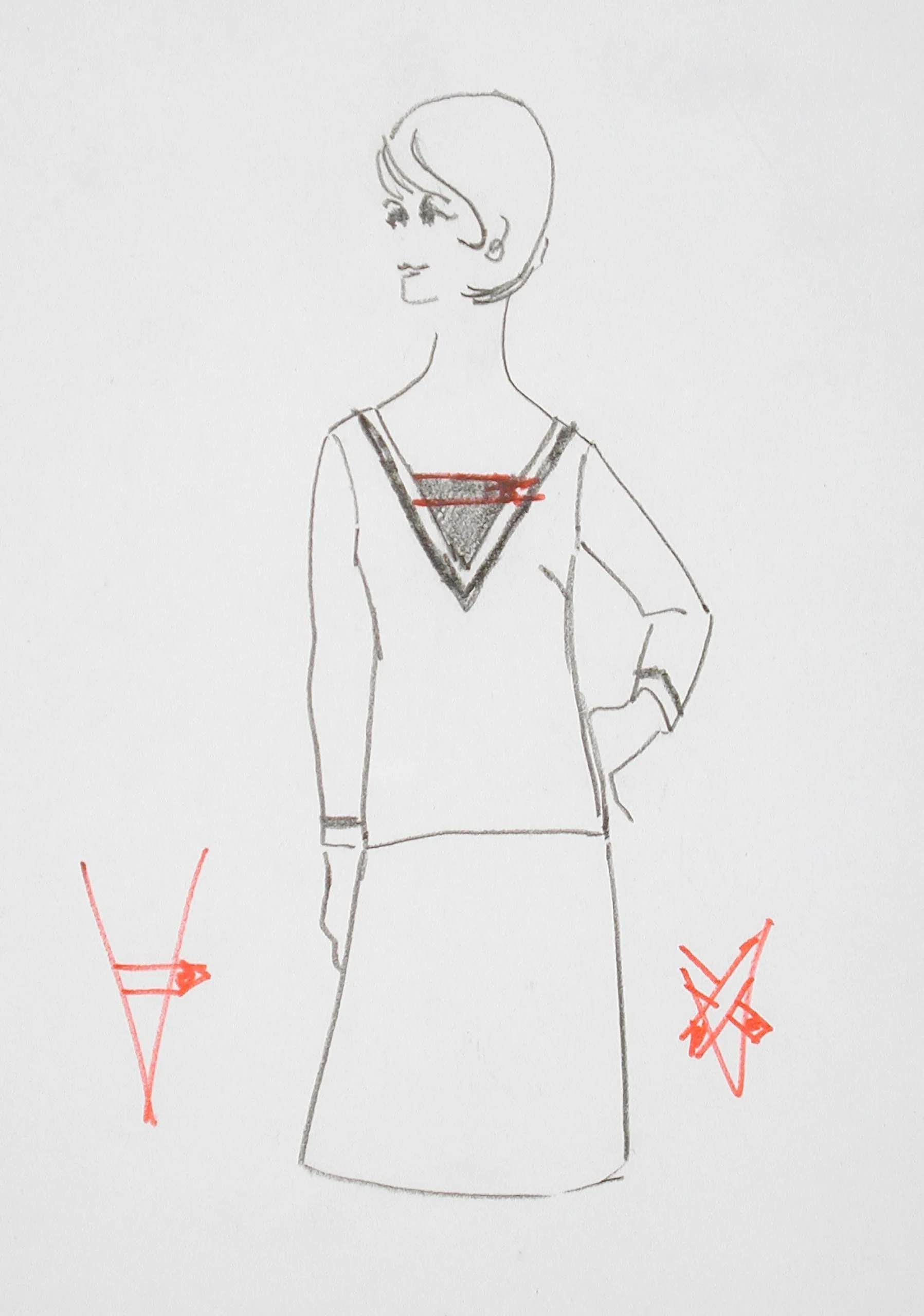 Pencil and red colored pencil fashion illustration of a standing female figure in a loose top with a V-neckline detail, shown in three-quarter profile, with two small detail sketches below