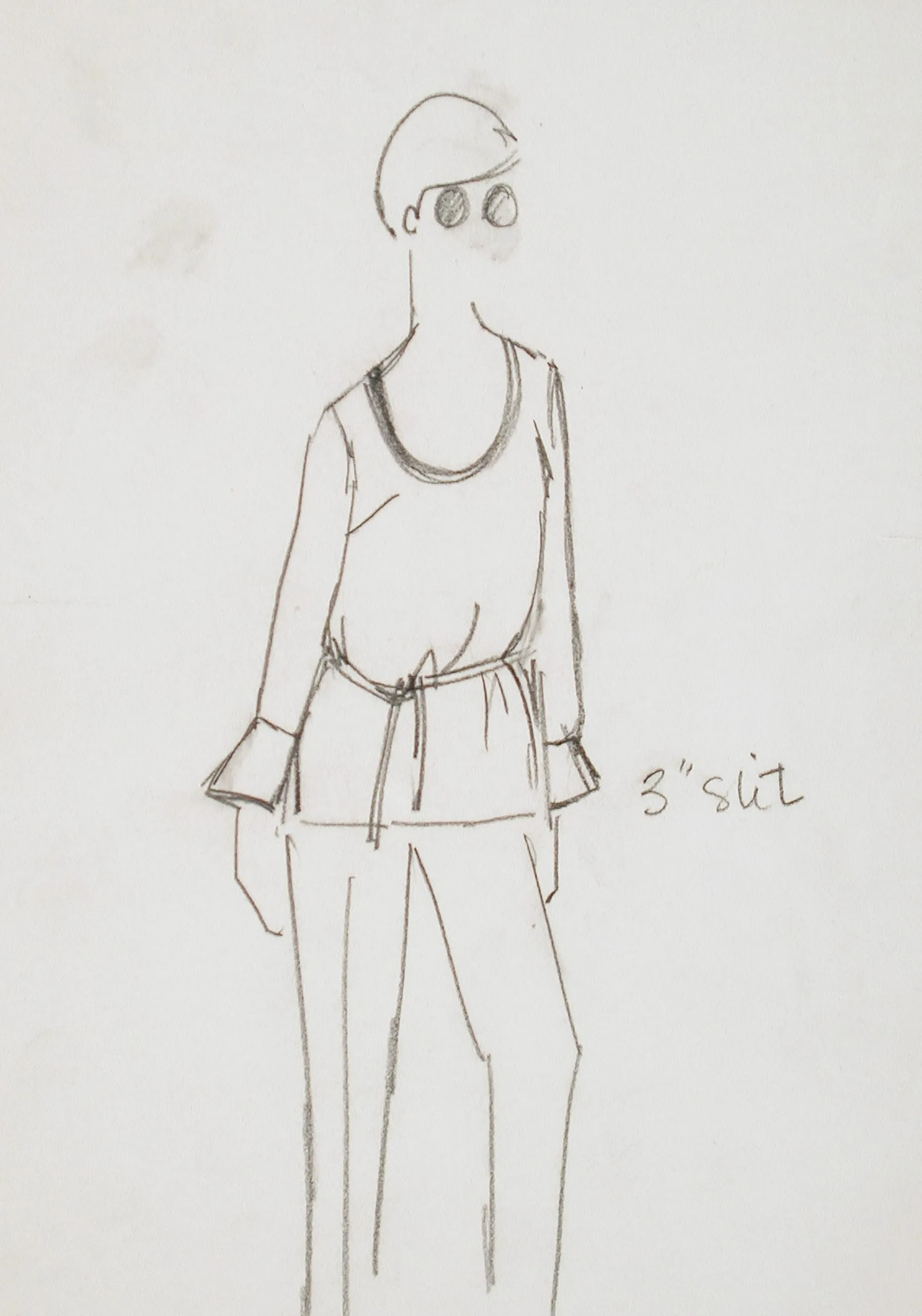 Pencil sketch on off-white paper of a standing fashion figure in a belted, flared-cuff tunic and wide-leg trousers, seen from behind in three-quarter view, with a handwritten note reading '3" slit'