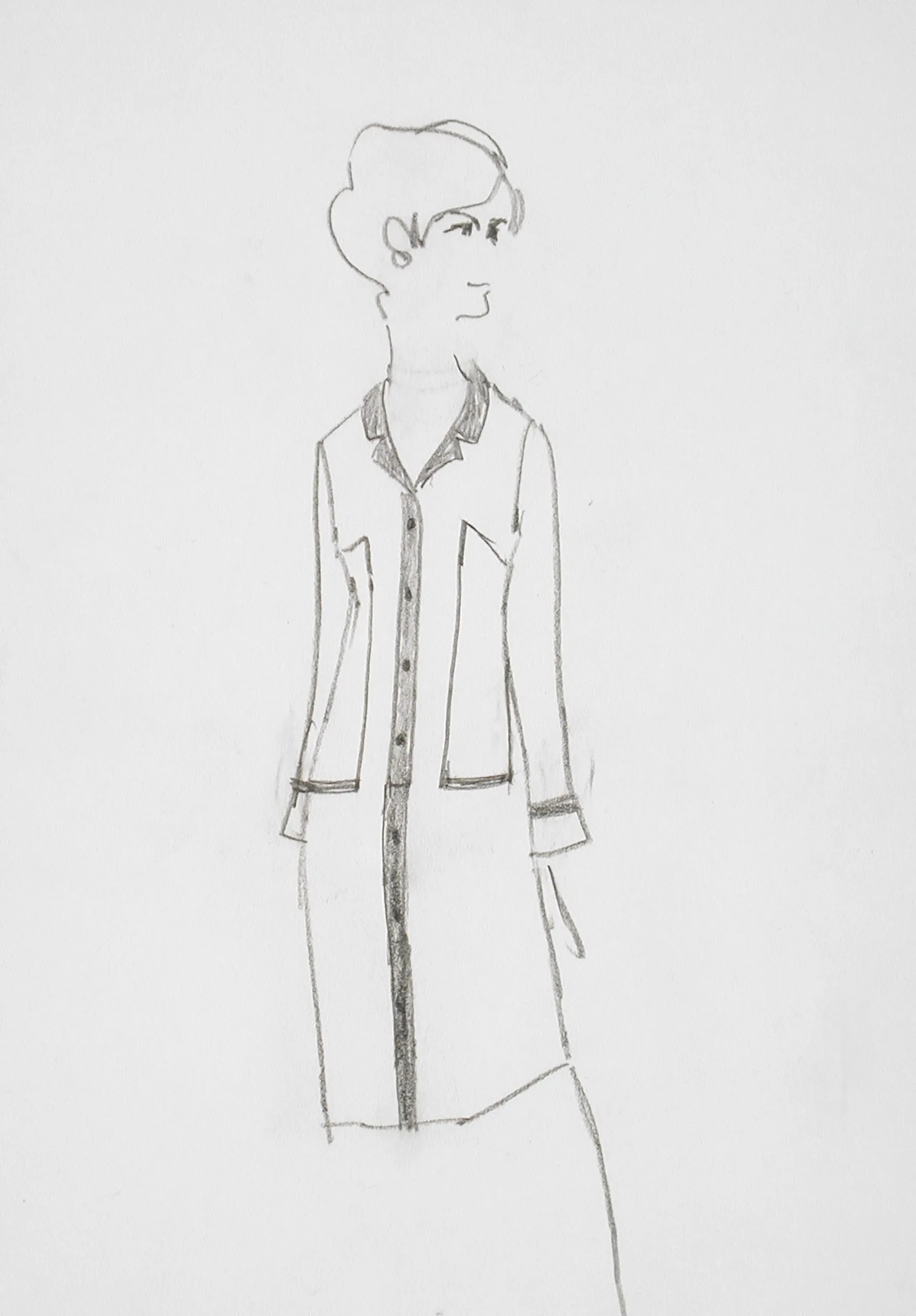 Graphite pencil drawing of a standing figure in a knee-length shirt dress with notched collar, contrasting trim, and center-front buttons, on white paper