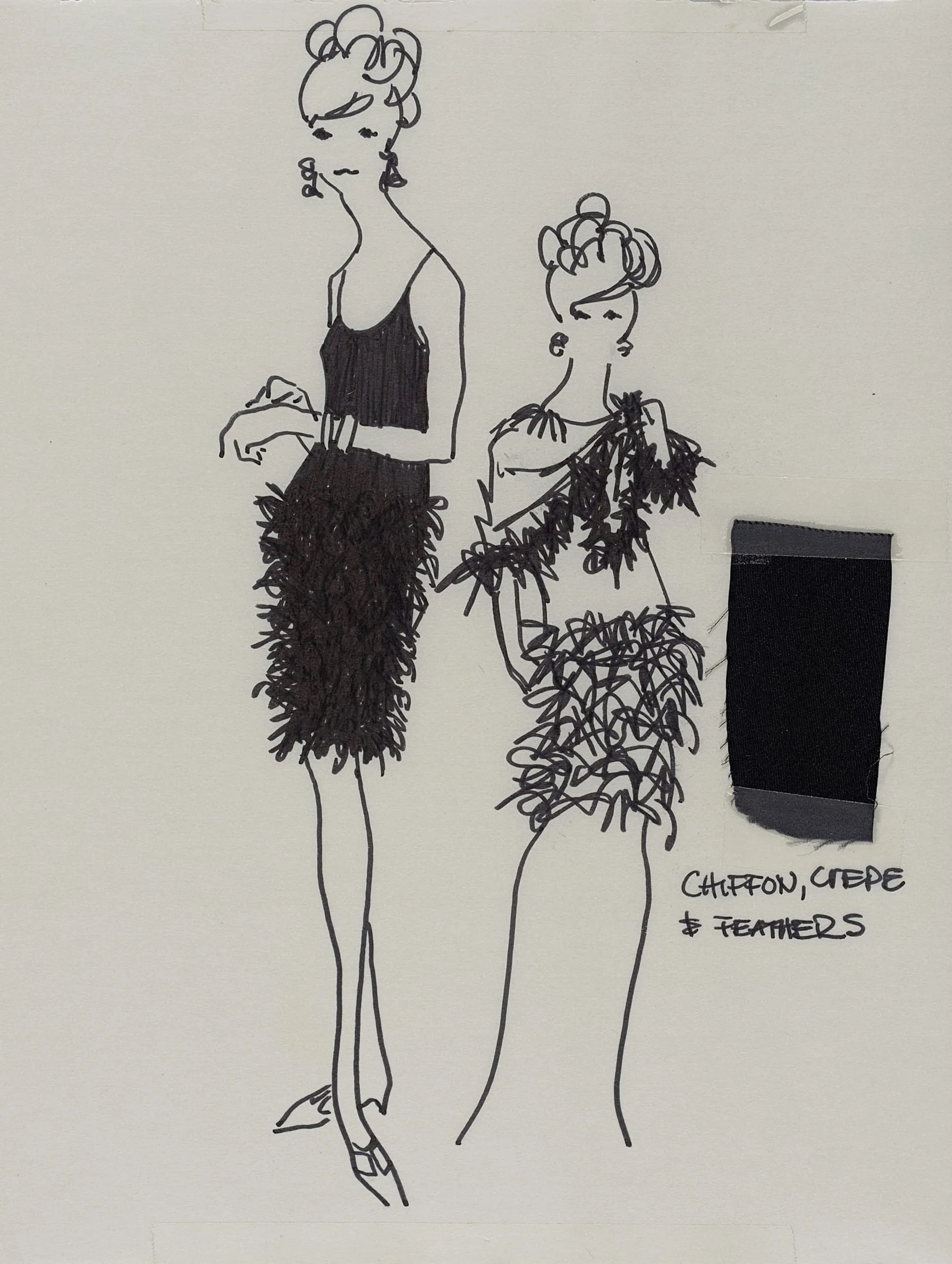 Ink fashion illustration on off-white paper, two stylized figures in black feathered and fringed garments, with an attached black fabric swatch and handwritten annotation