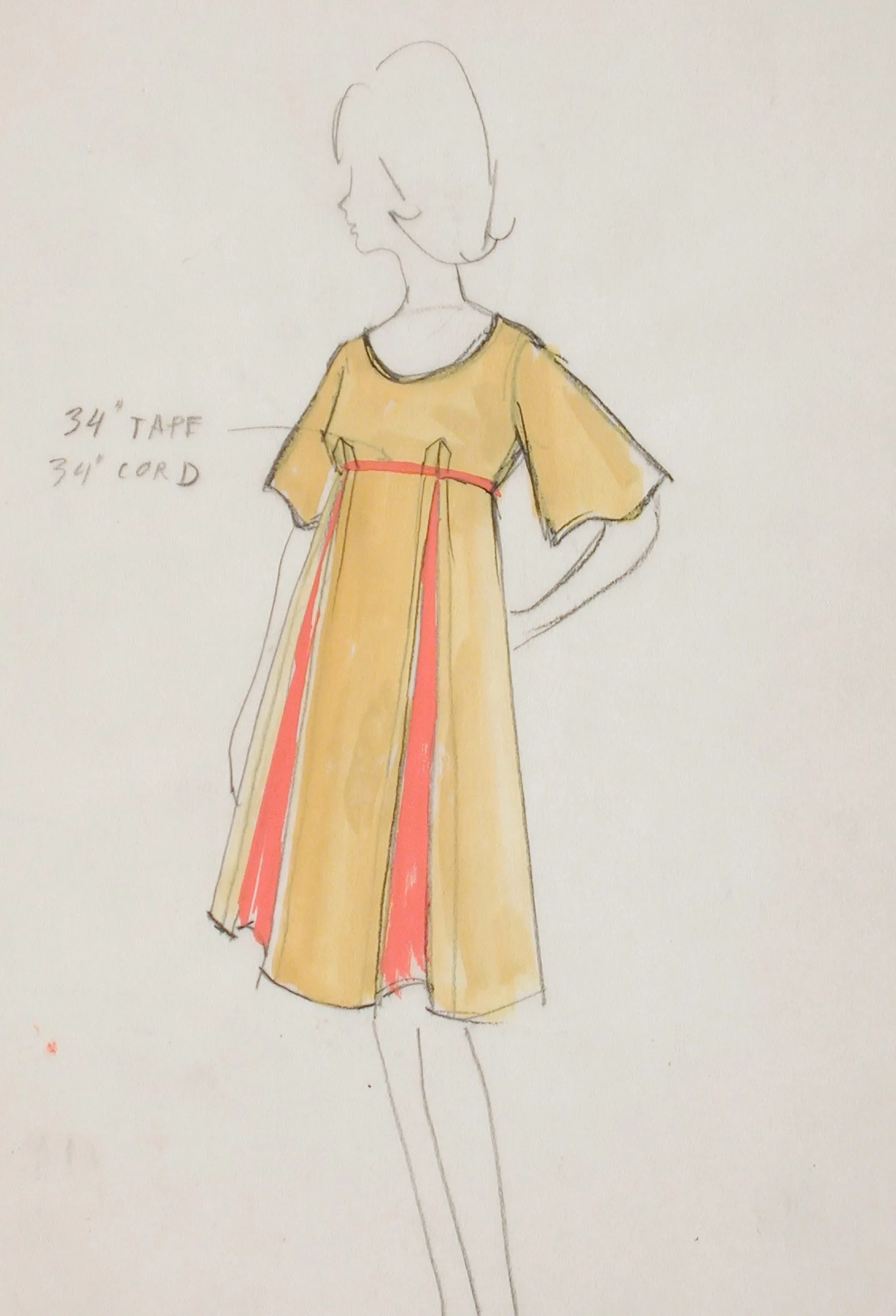 Fashion design drawing in pencil and color wash on cream paper, showing a full-length female figure in a mustard yellow shift dress with coral-red vertical panels and empire waistband, with handwritten annotations