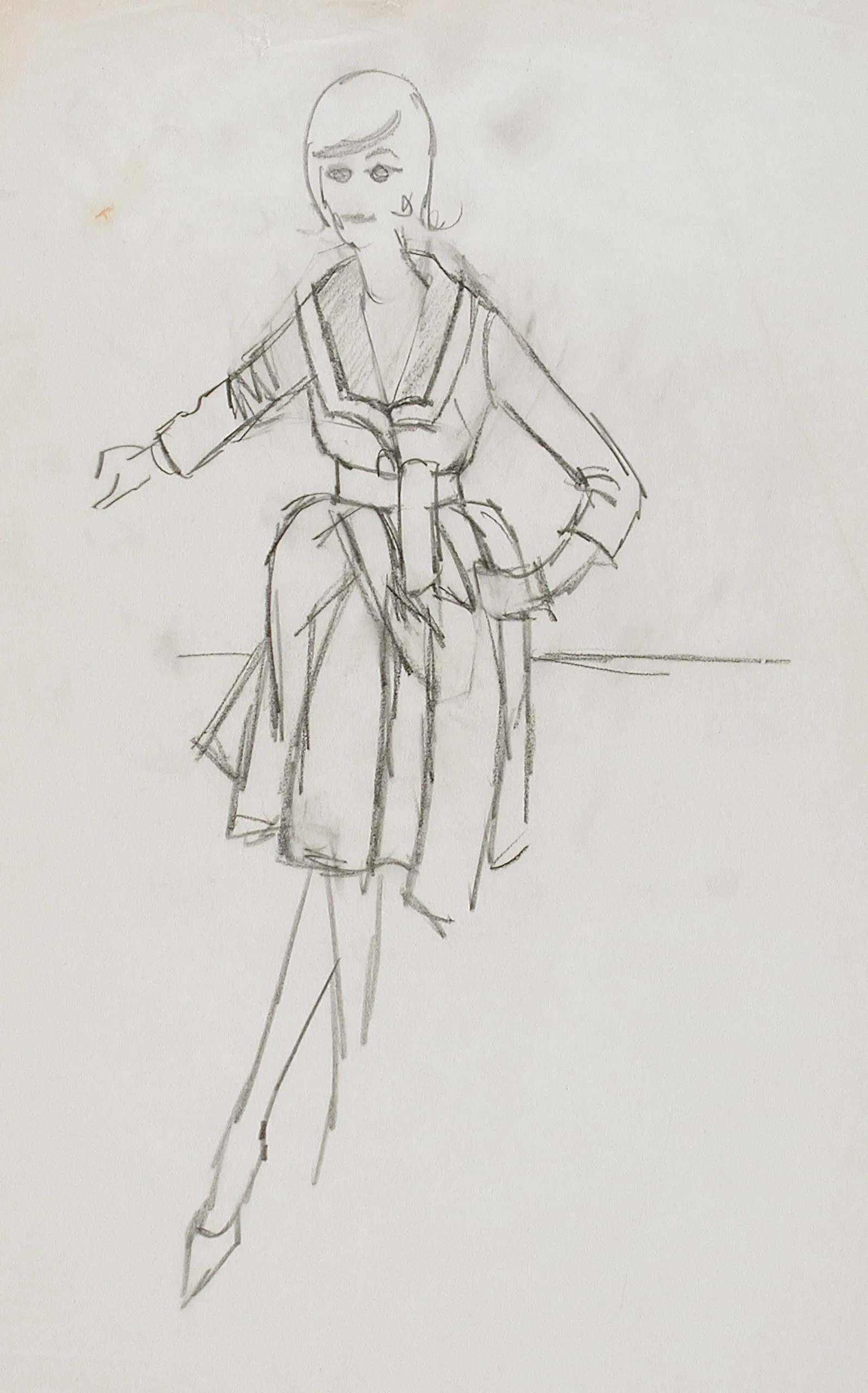 Pencil fashion illustration on off-white paper, full-length female figure in a belted, flared coat with wide collar, rendered in loose gestural strokes