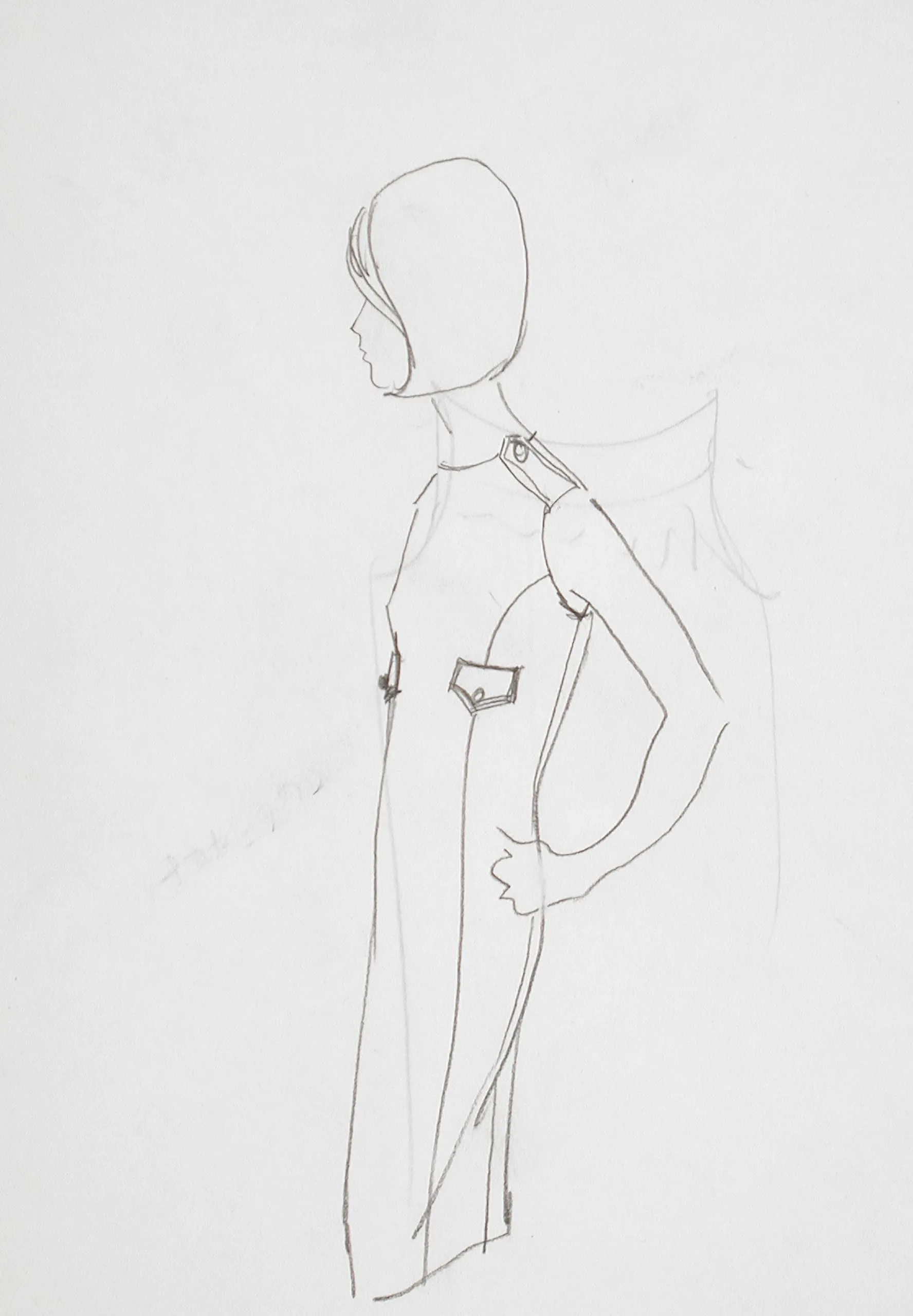Pencil fashion sketch on white paper, full-length figure in profile wearing a sleeveless column dress with pocket details and a flowing cape behind
