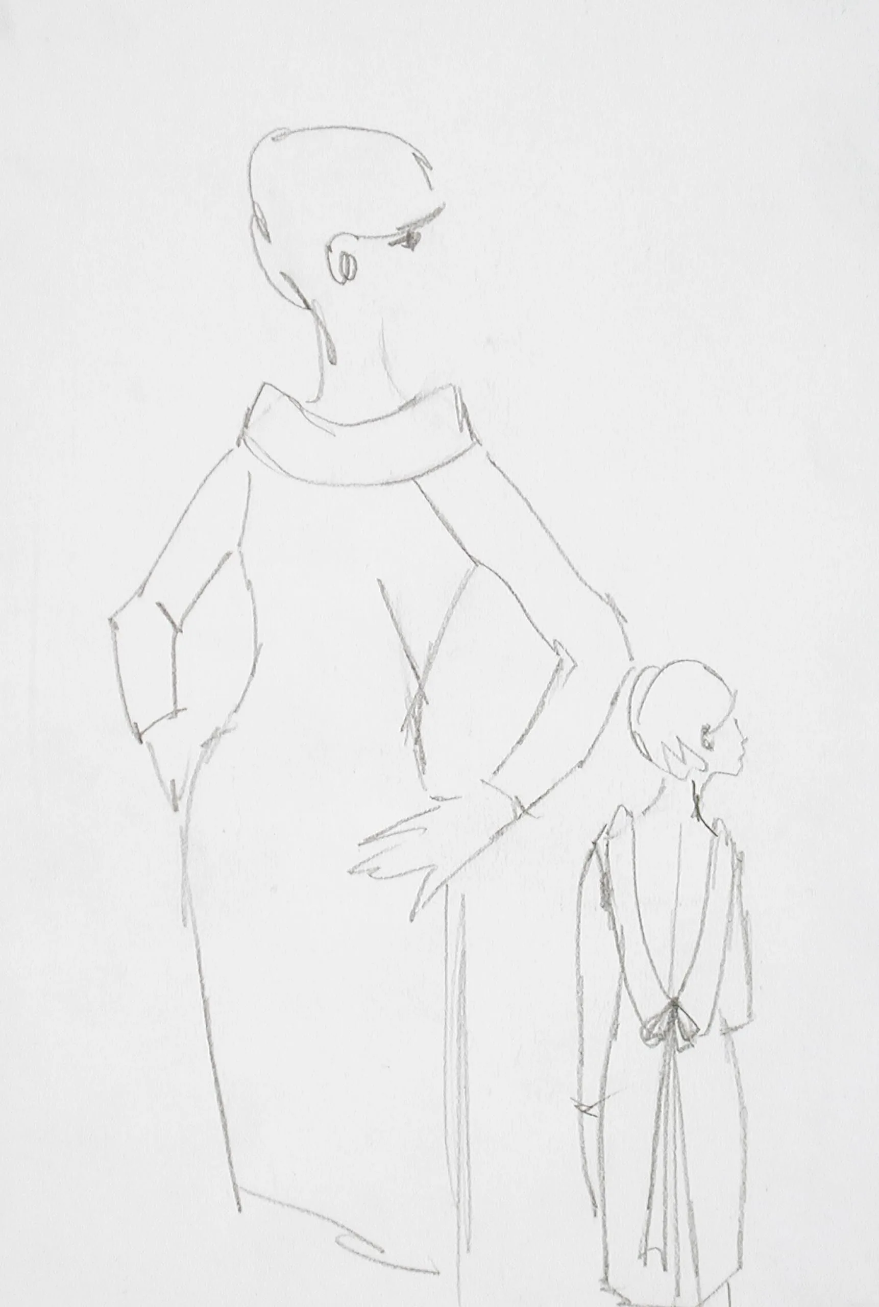 Pencil drawing on white paper of two figures in profile, a tall adult and a much smaller child-scale figure, both facing right, rendered in loose gestural outlines