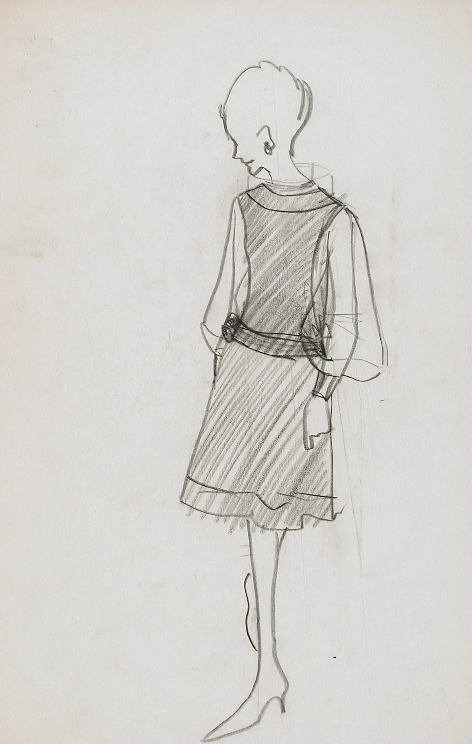 Graphite drawing on off-white paper, full-length fashion sketch of a woman from behind, wearing a sleeveless overdress with hatched shading over a long-sleeved blouse