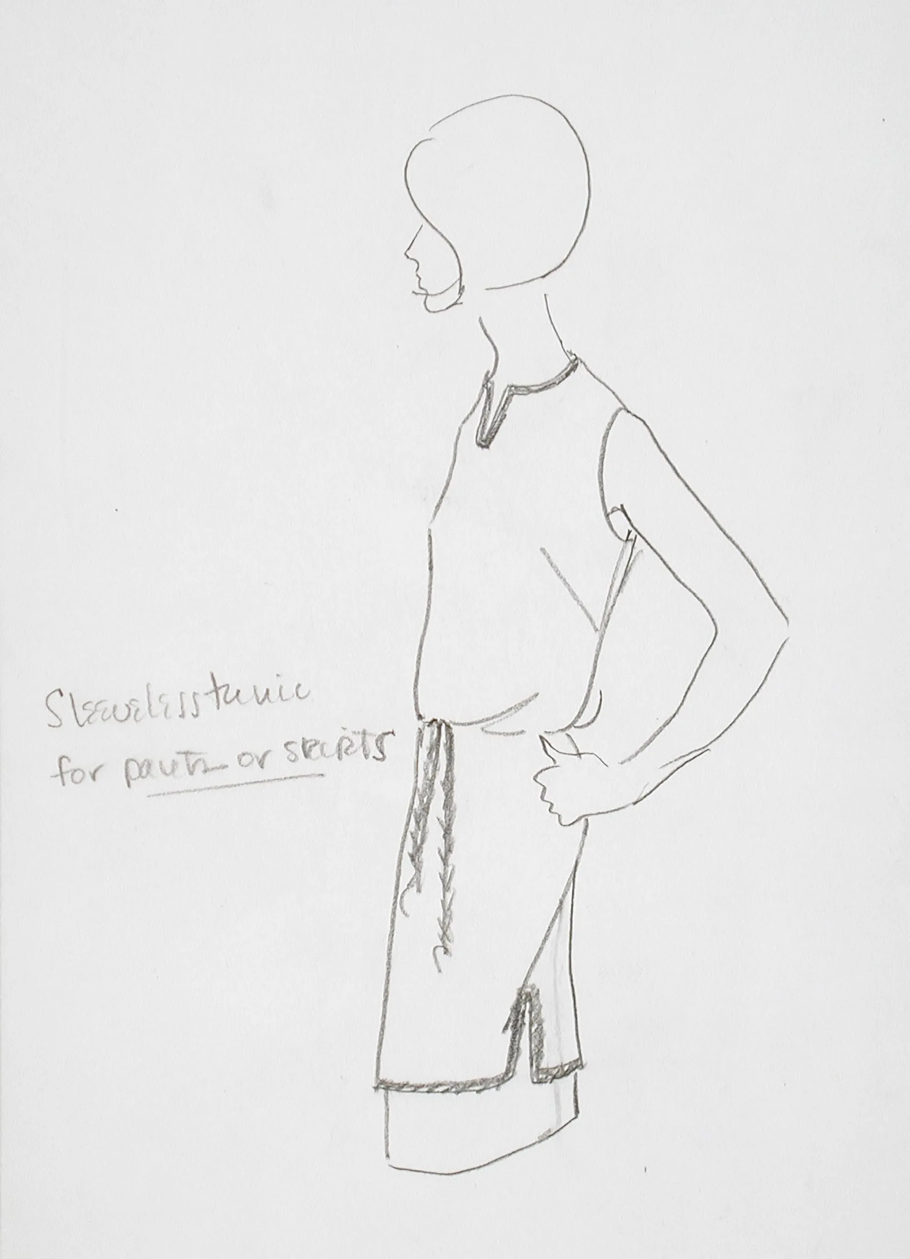 Graphite fashion illustration on white paper, full-length figure in profile wearing a sleeveless belted tunic with handwritten annotation