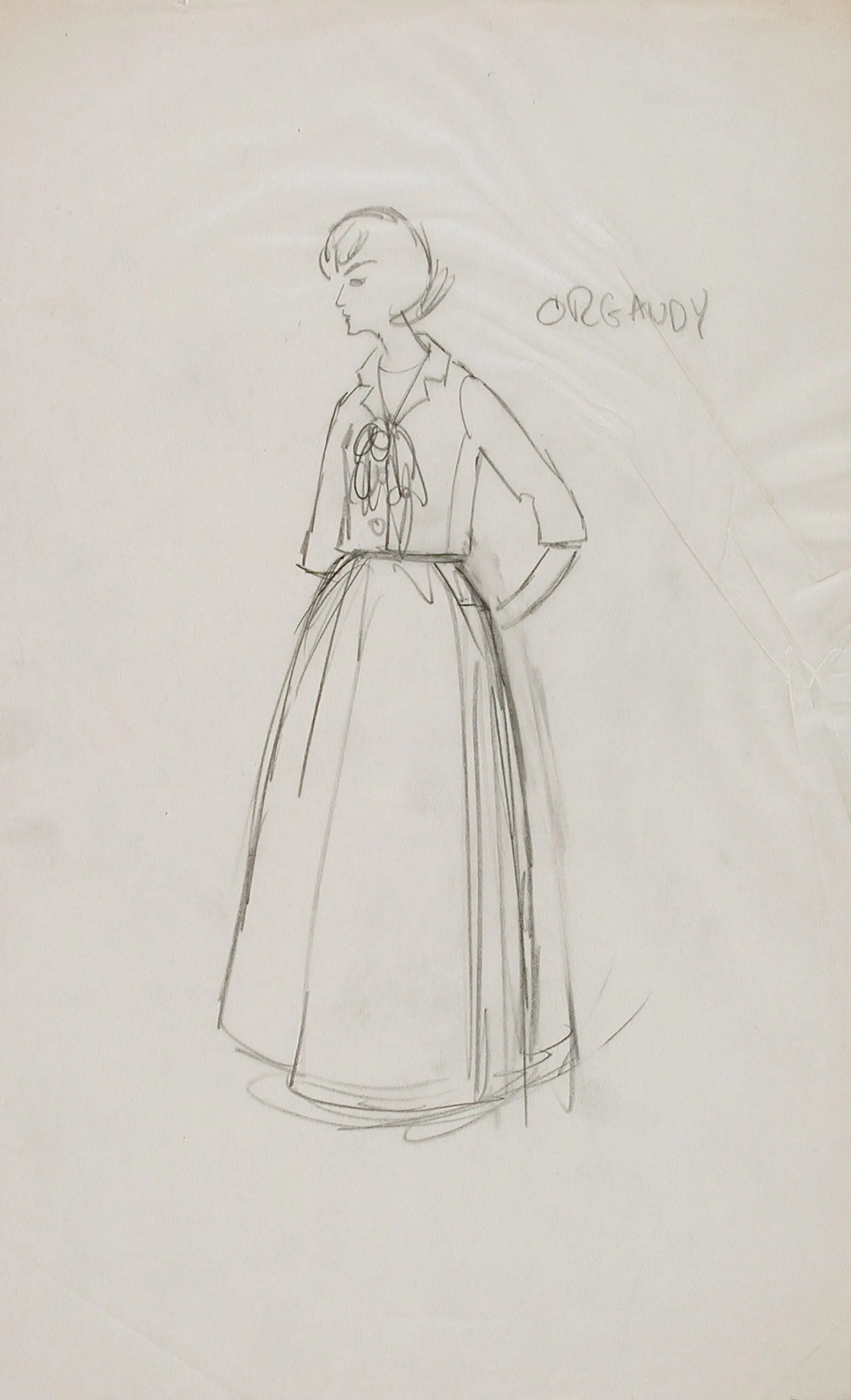Pencil fashion sketch on cream paper, full-length figure in profile wearing a collared blouse with bow neckline and full-length skirt, with handwritten annotation 'ORGAUDY'