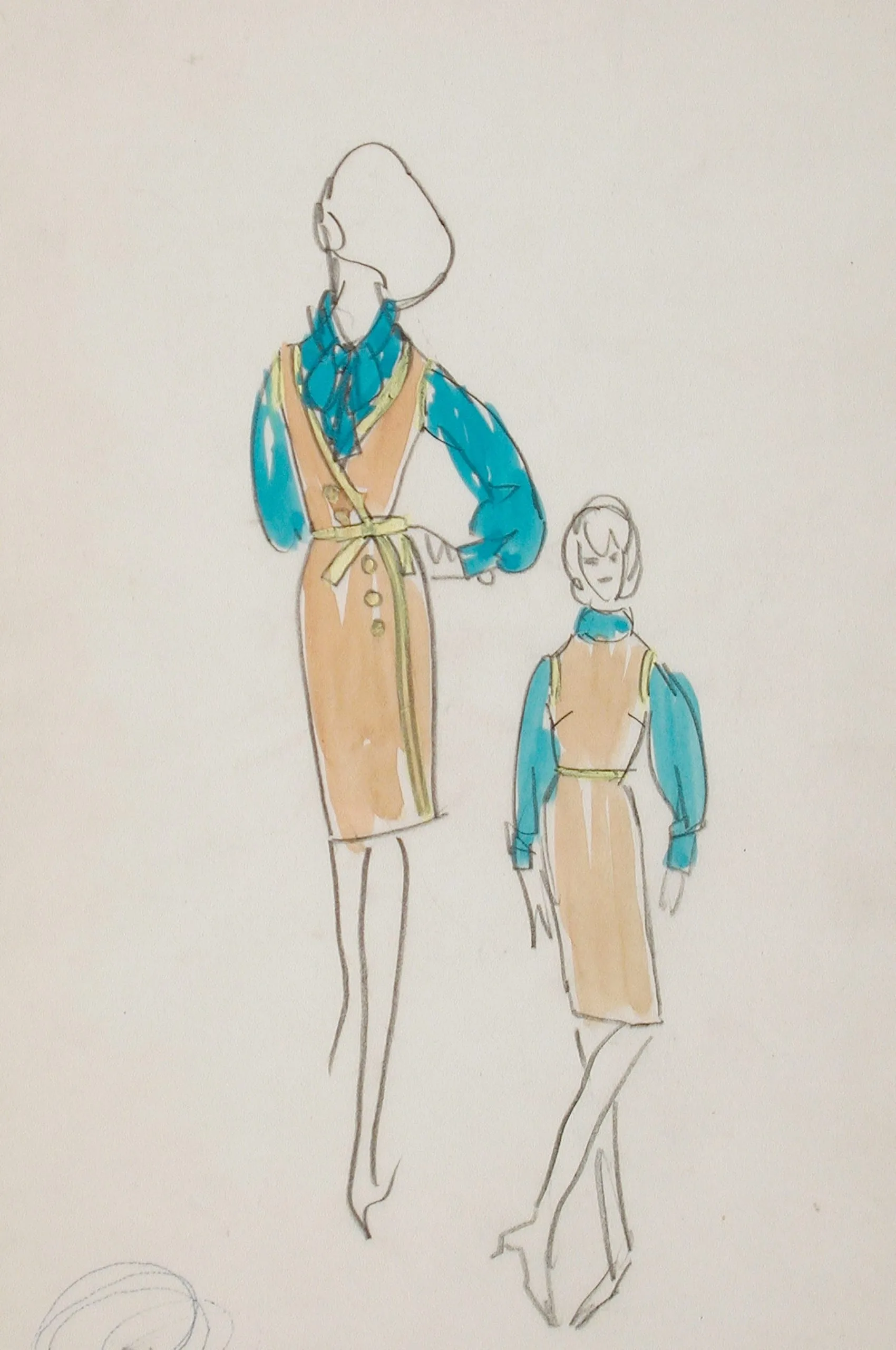 Fashion illustration in pencil and marker on off-white paper, showing two female figures in matching tan jumper dresses over teal blouses, back and front views