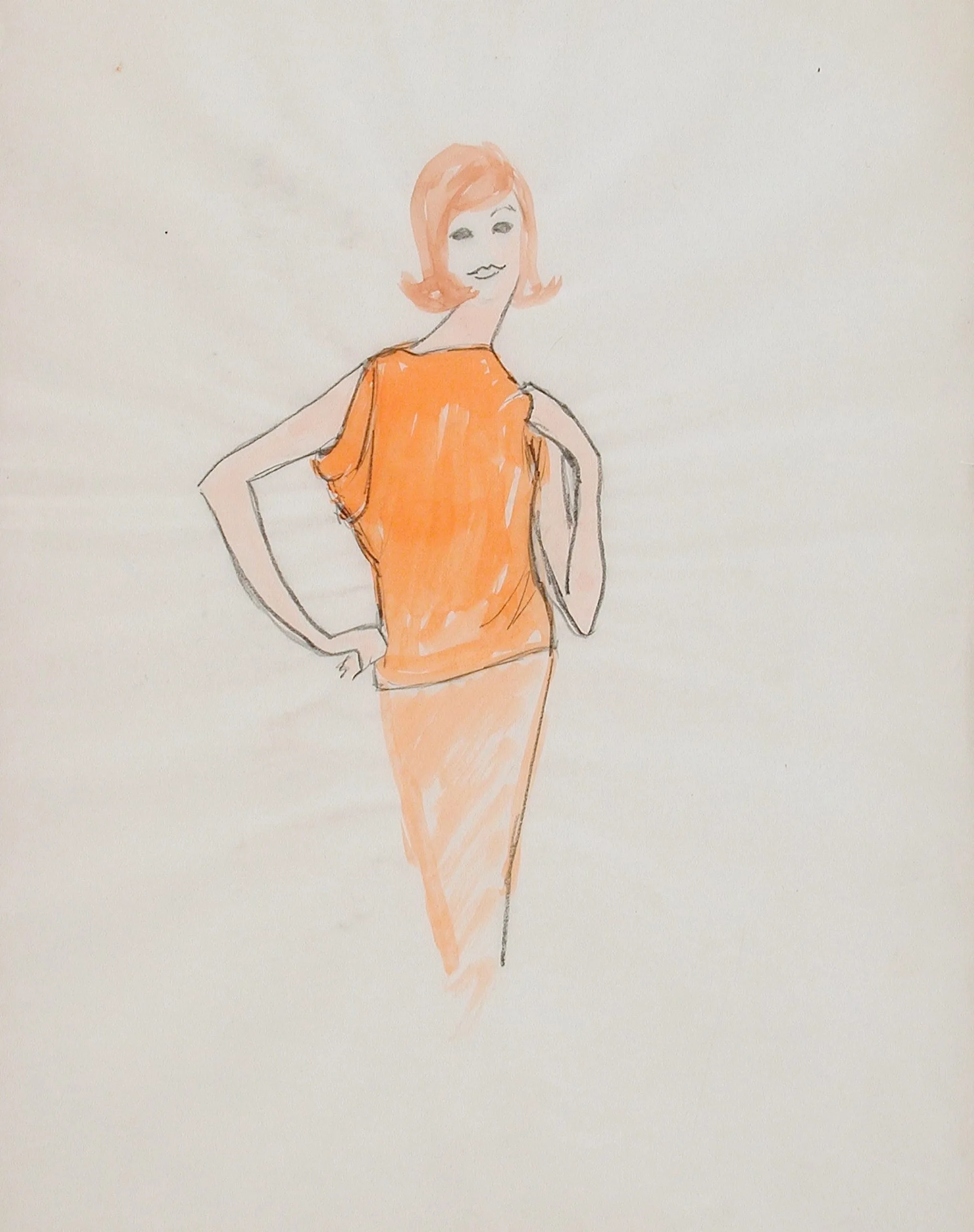 Fashion illustration in pencil and colored pencil on off-white paper, full-length figure of a woman in an orange top and peach skirt, hands on hips, loose gestural lines