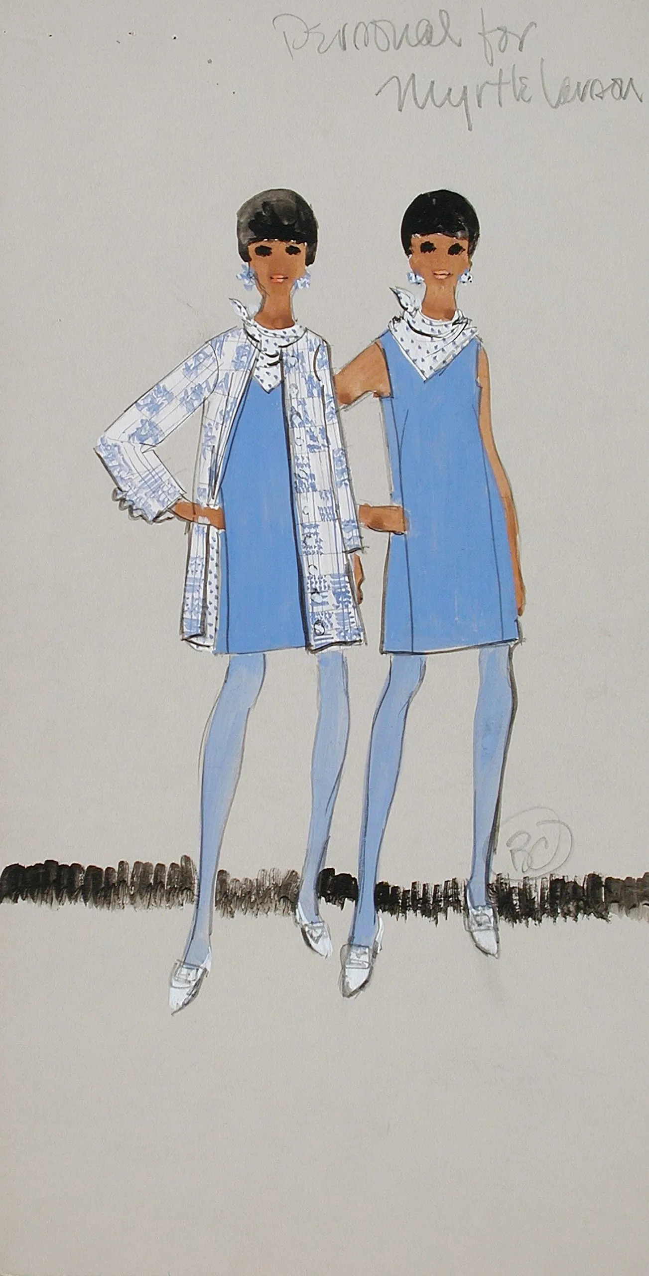 Gouache fashion illustration on cream paper showing two stylized figures in periwinkle-blue shift dresses and tights, one wearing a printed white coat, with a handwritten inscription at top