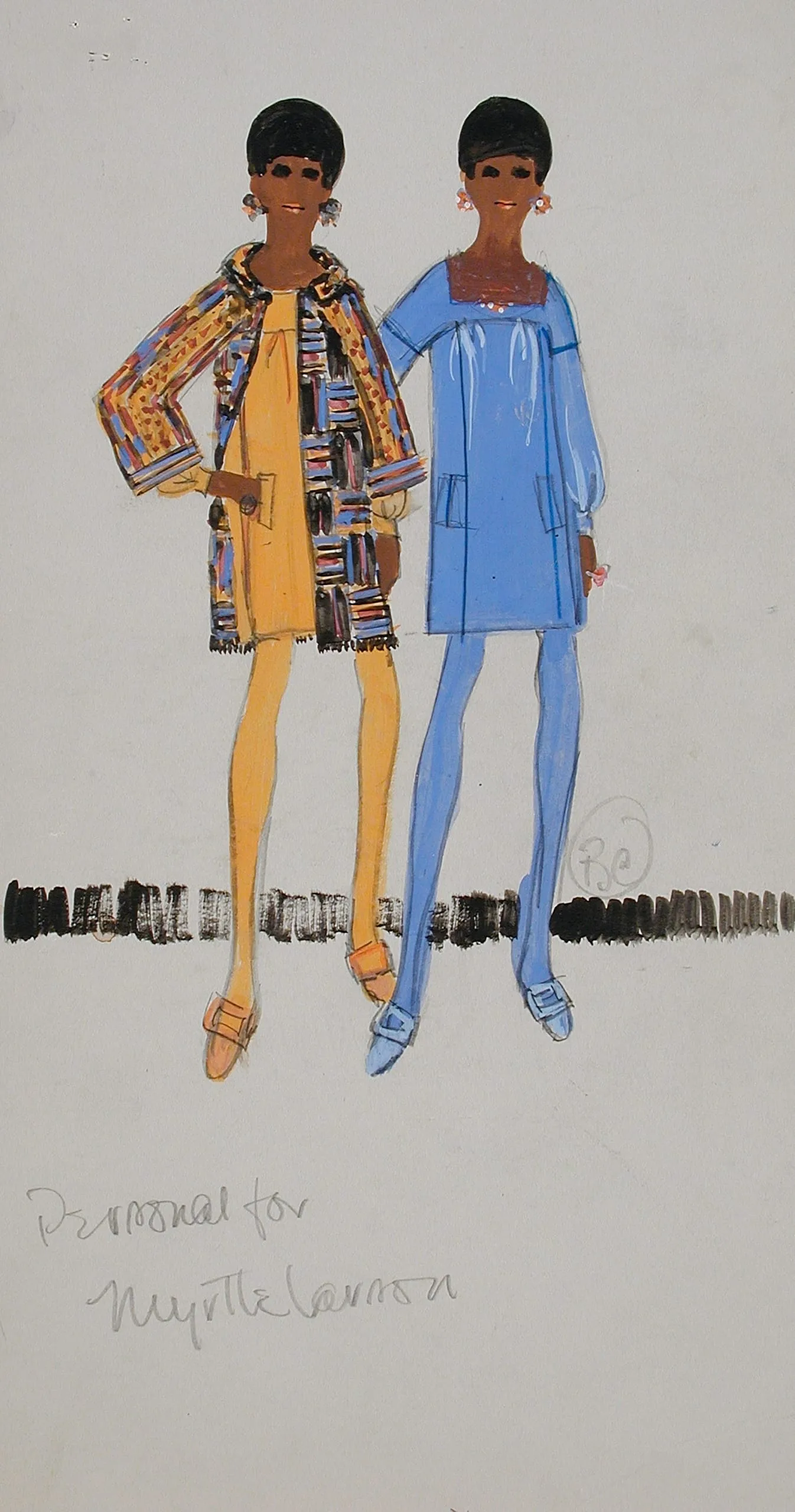 Gouache fashion illustration of two full-length figures in 1960s-style outfits: one in a mustard dress with a multicolored striped jacket, one in a cornflower blue shift dress with long sleeves