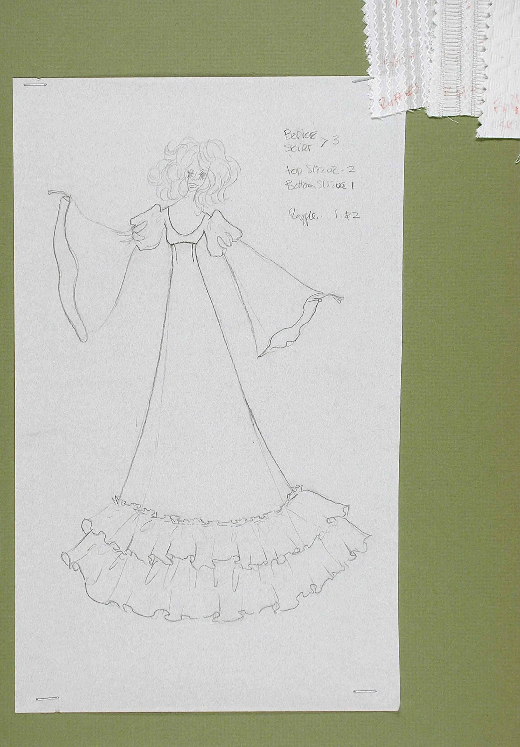 Pencil costume design drawing on white paper, full-length female figure in a gown with wide flowing sleeves and three-tiered ruffled hem, with handwritten annotations