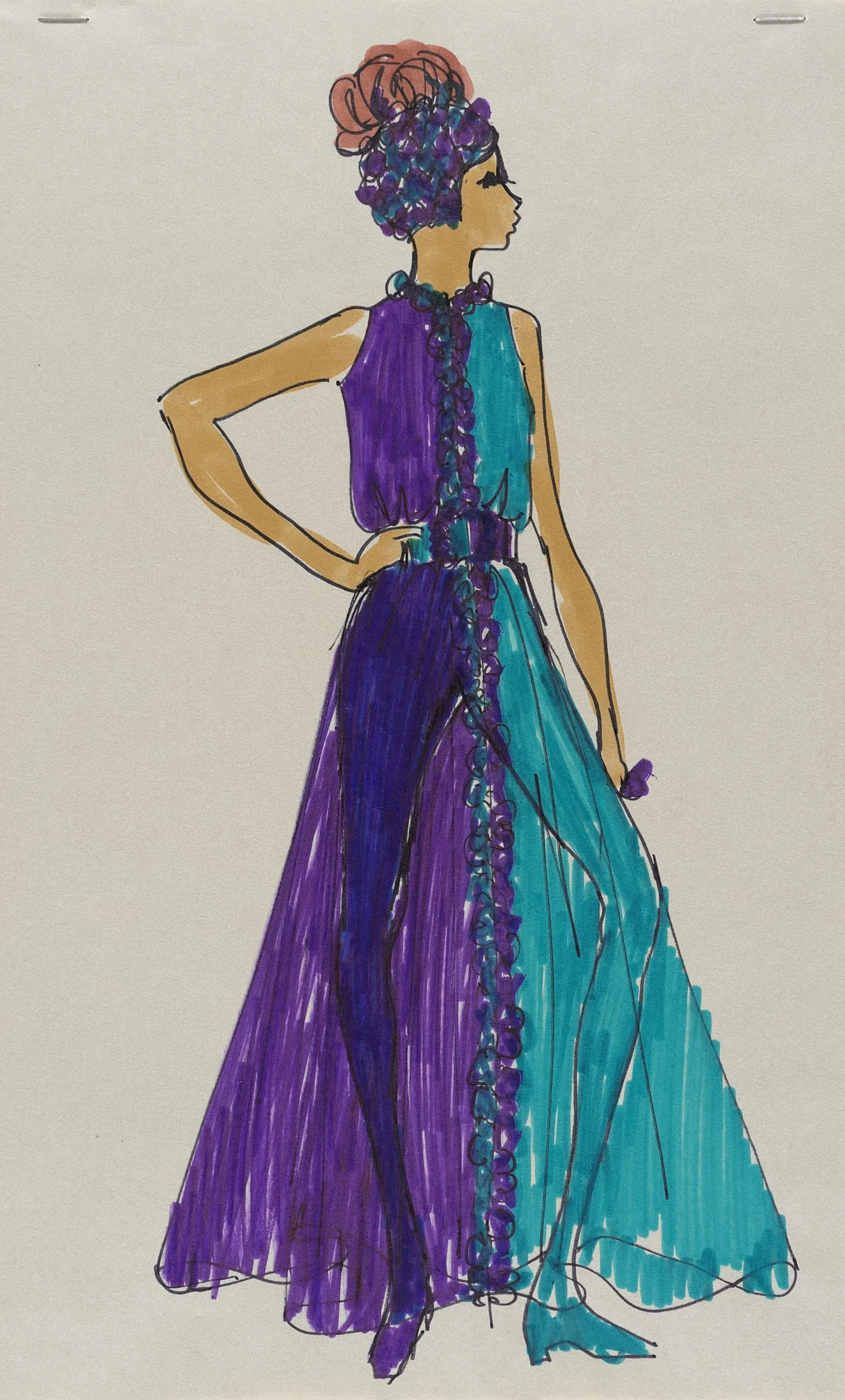 Fashion illustration in marker and ink on cream paper, full-length figure in profile wearing a two-tone violet and teal floor-length gown with ruffled center trim