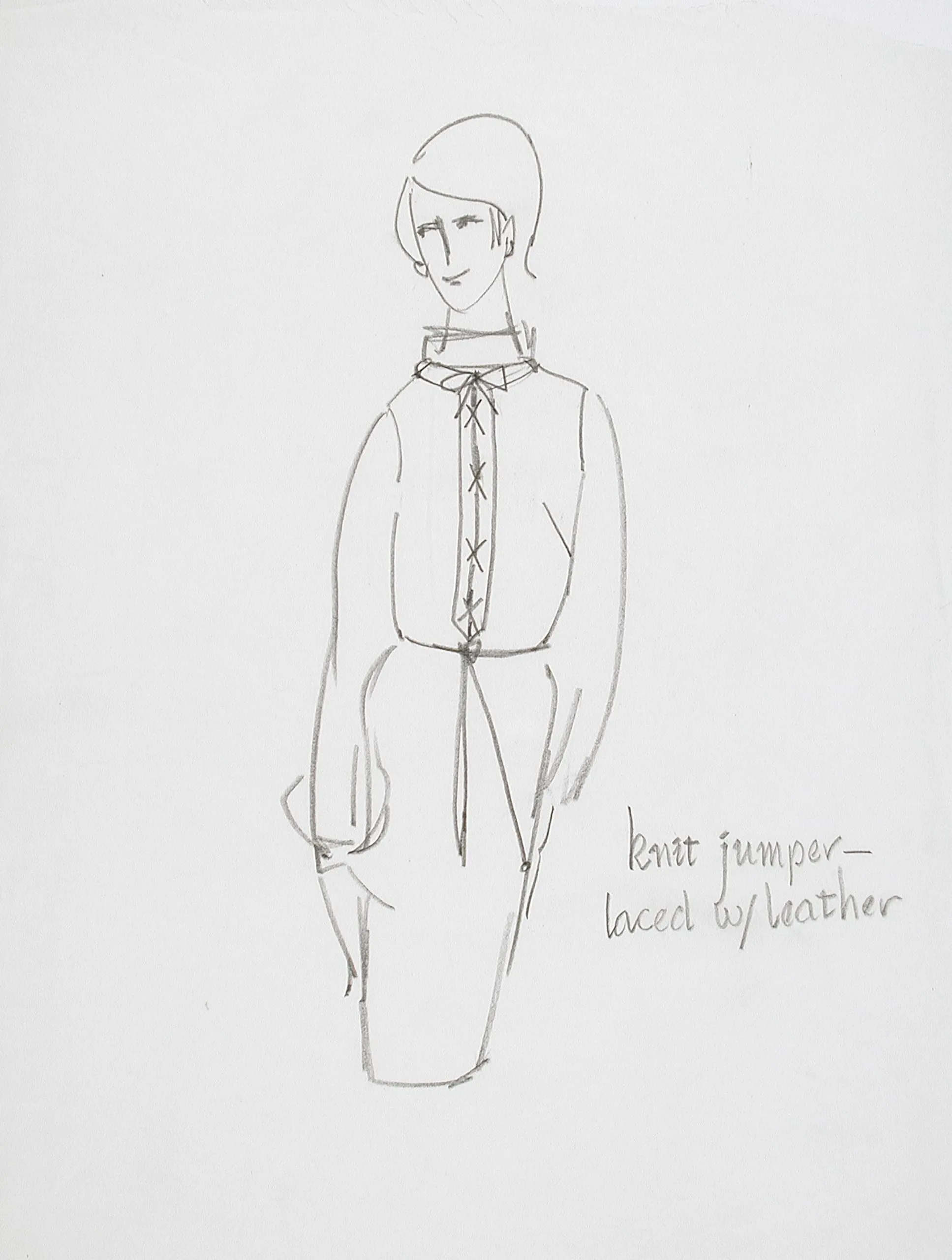 Pencil fashion illustration on white paper, full-length female figure in a belted knit jumper with laced center-front detail, with handwritten annotation