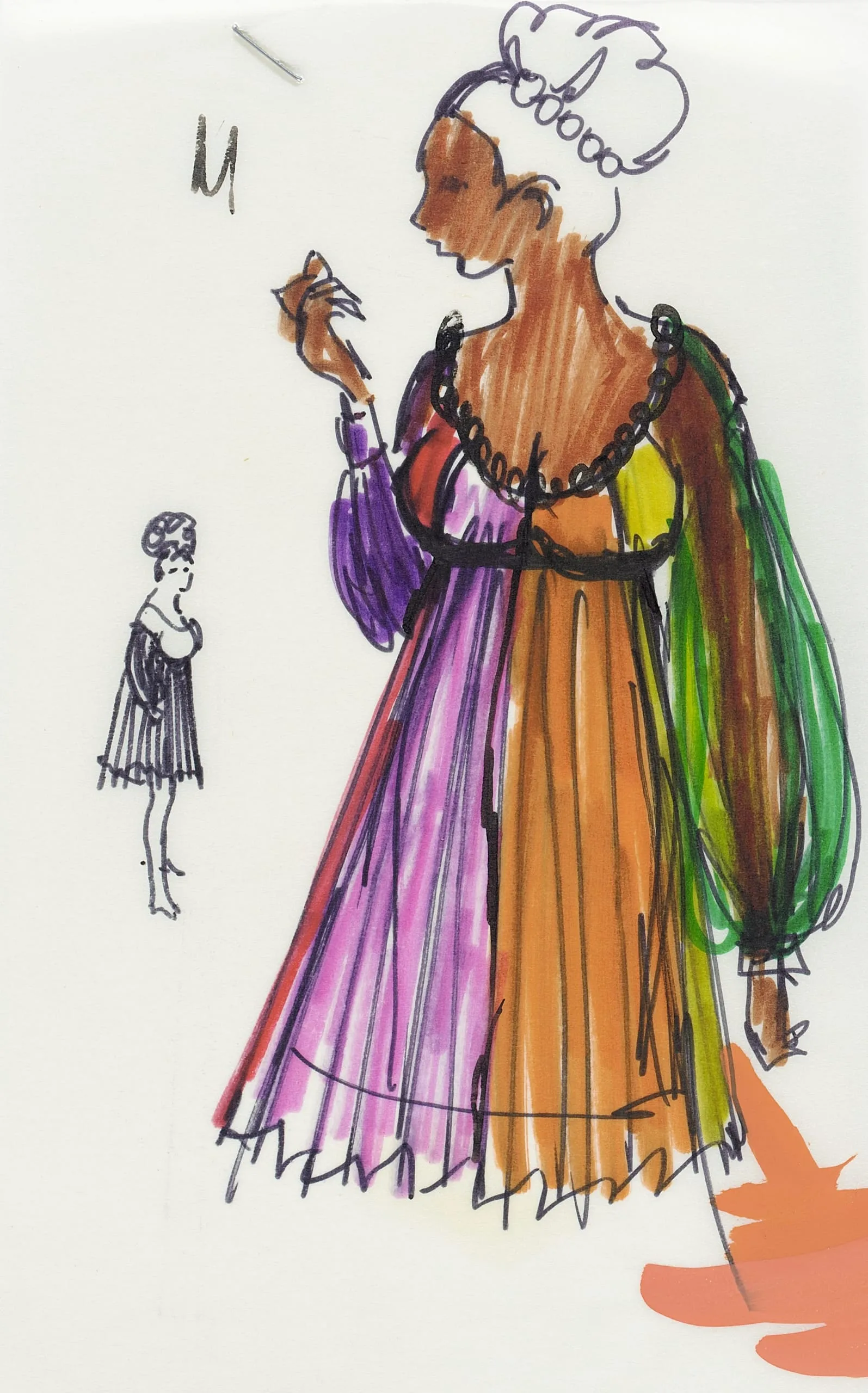 Ink and marker costume design sketch of a woman in profile wearing a floor-length gown with bold purple, orange, green, and yellow color panels and black chain trim detailing