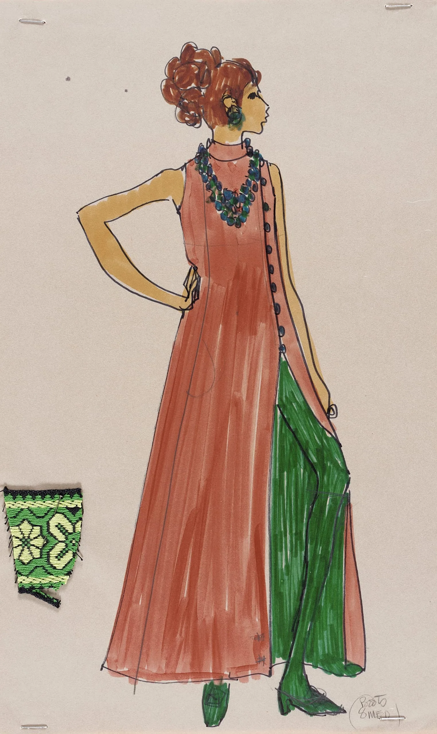 Fashion illustration in ink and wash on tan paper, full-length female figure in profile wearing a terracotta tunic dress with green wide-leg trousers and a beaded necklace, with a fabric swatch to the left