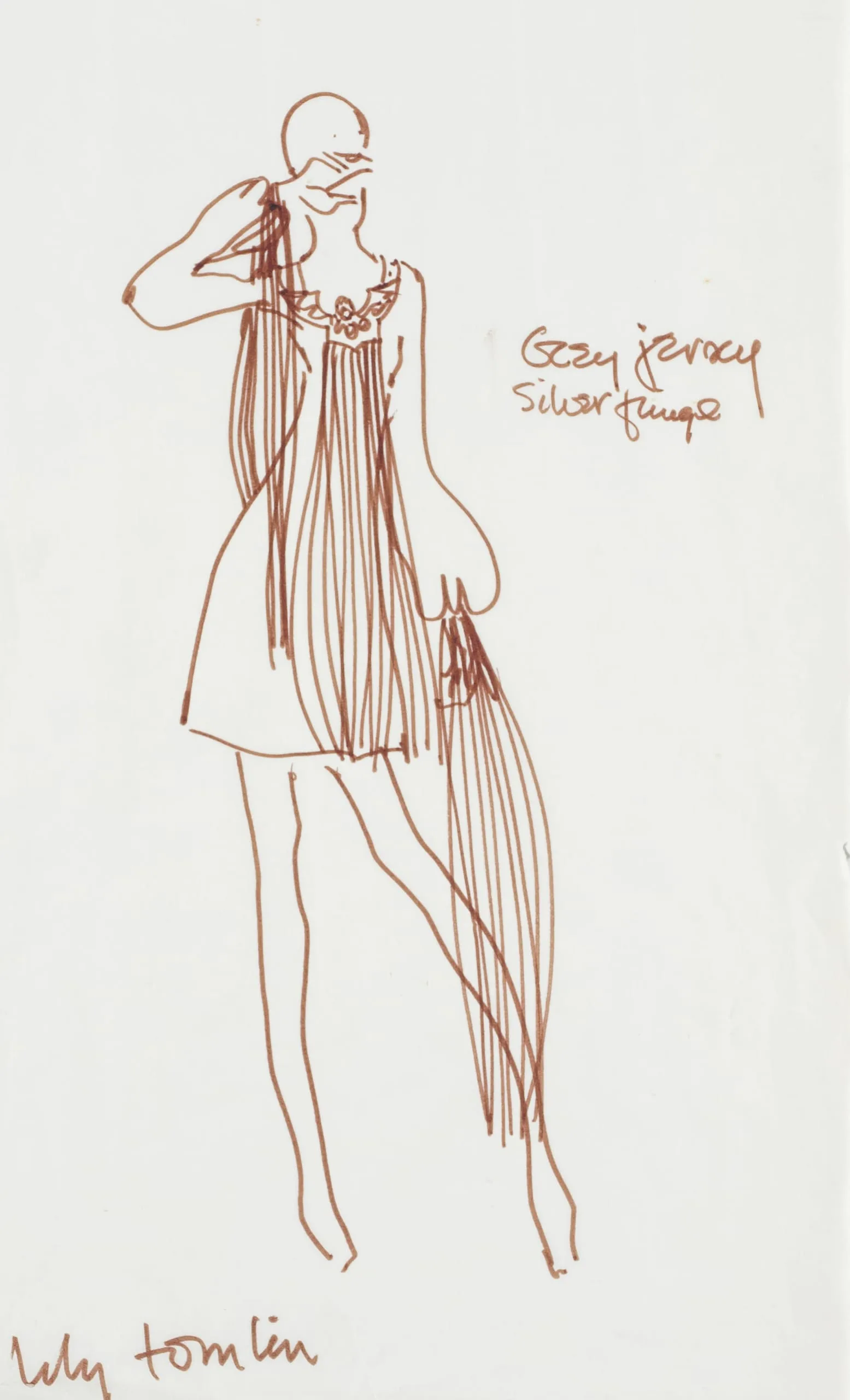 Fashion illustration in rust-brown ink on white paper, full-length figure in a fringed mini dress with handwritten annotations reading 'Cozy jersey / Silver fringe!' and 'Lily Tomlin'