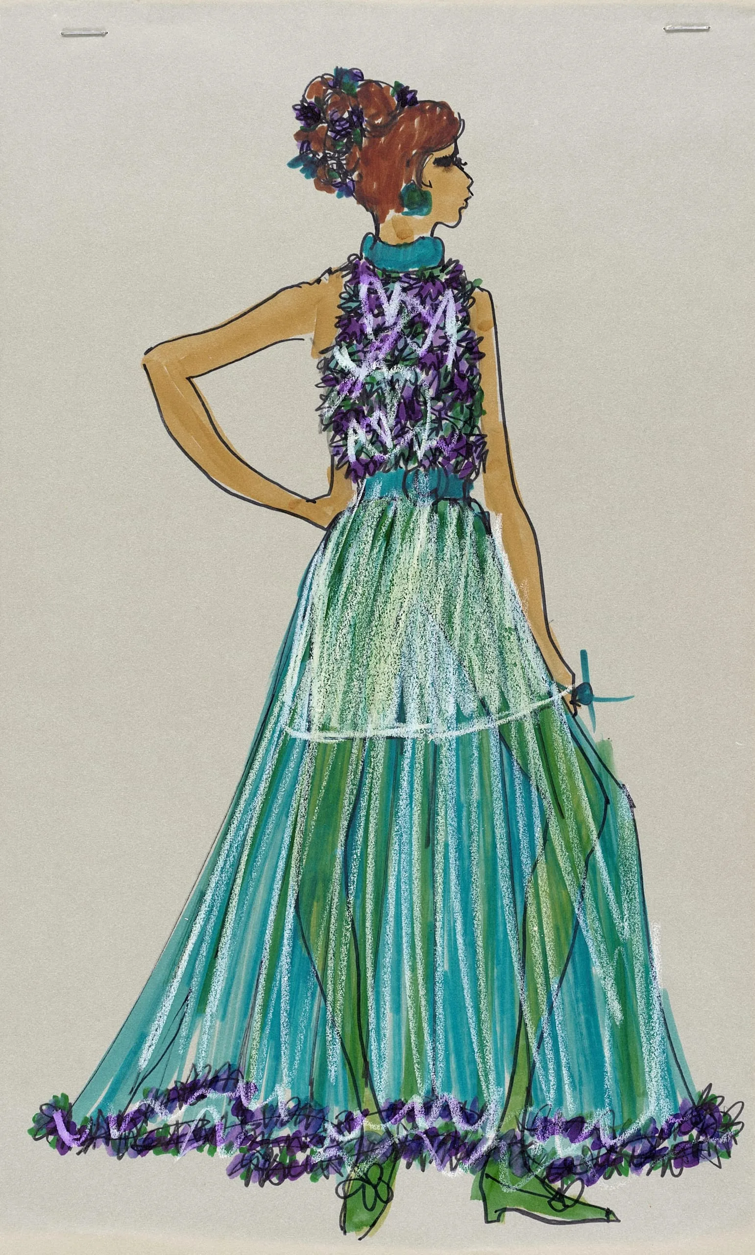 Fashion illustration in marker and pastel on gray-beige paper, full-length figure from behind in a gown with purple fringed bodice and sweeping aqua and green pleated skirt