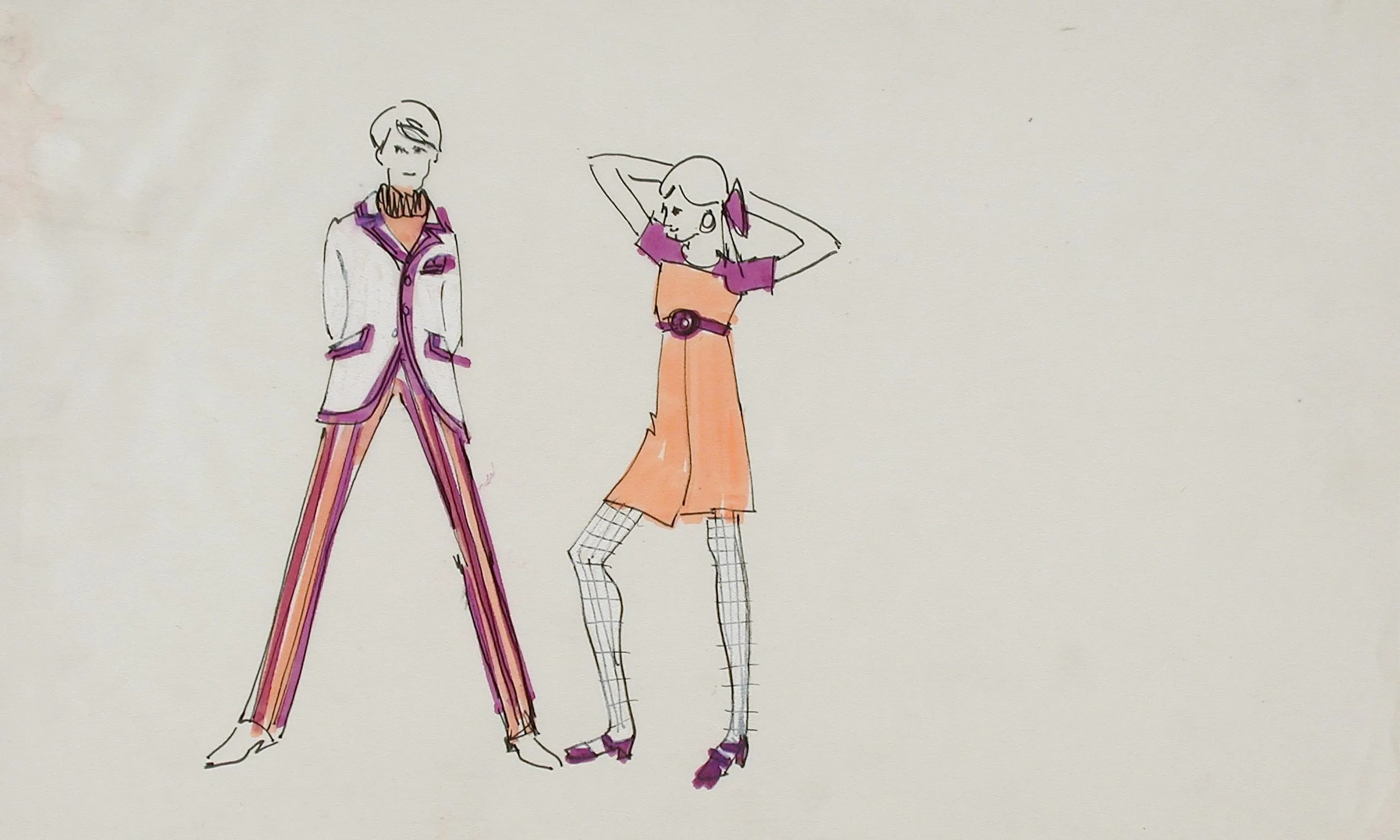 Fashion illustration in black ink and marker on cream paper, two elongated figures: a man in a white blazer with purple trim and striped trousers, a woman in an orange mini dress with magenta gloves and patterned stockings