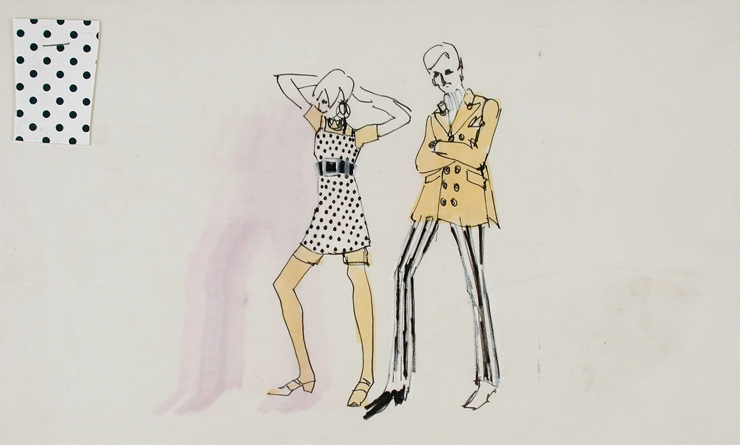 Fashion illustration in ink and wash on off-white paper, two elongated figures: a woman in a polka-dot mini dress and a man in a yellow double-breasted coat, with a fabric swatch affixed upper left