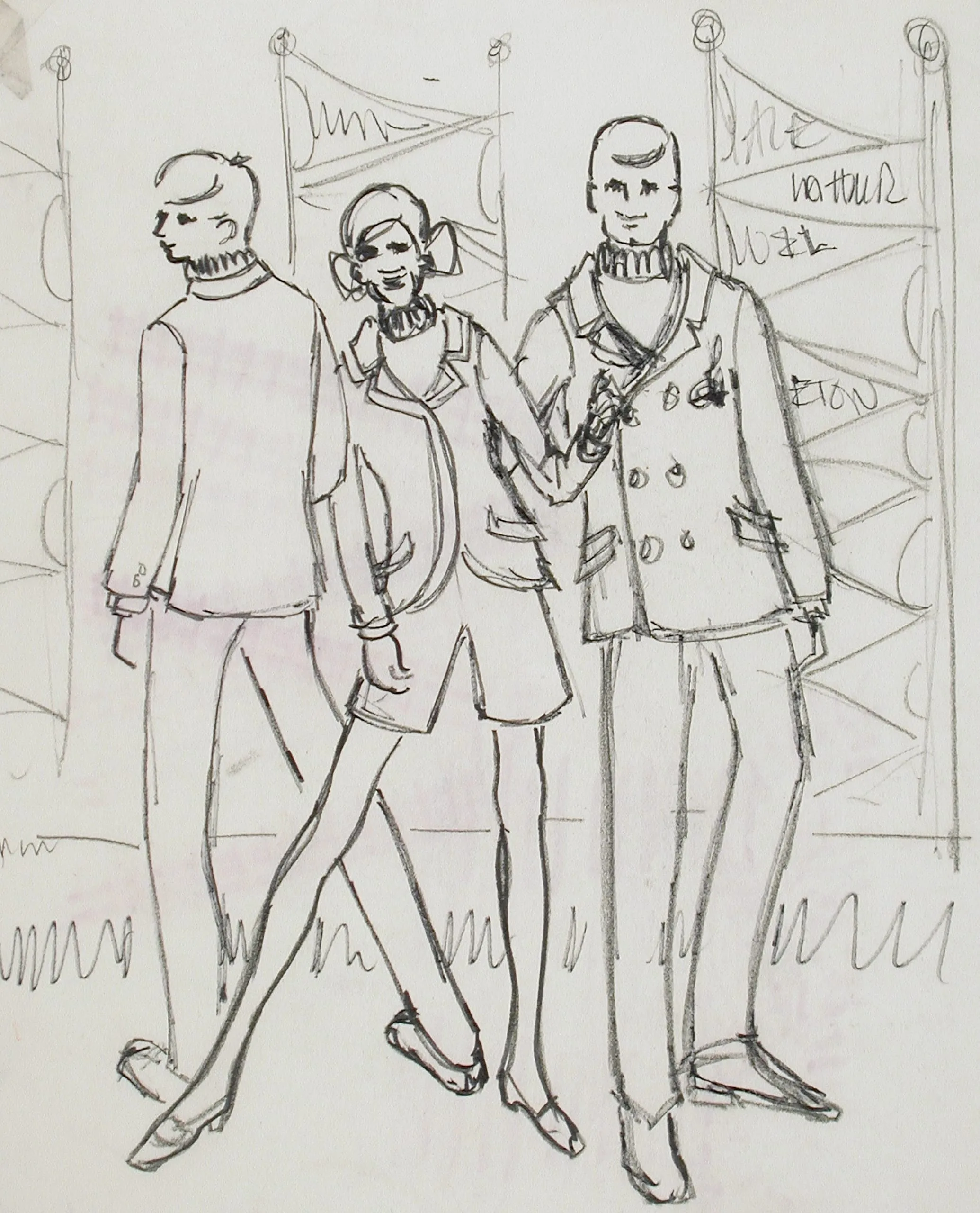 Graphite fashion sketch on off-white paper, three figures in coats and turtlenecks walking before a row of pennant flags, loose gestural lines