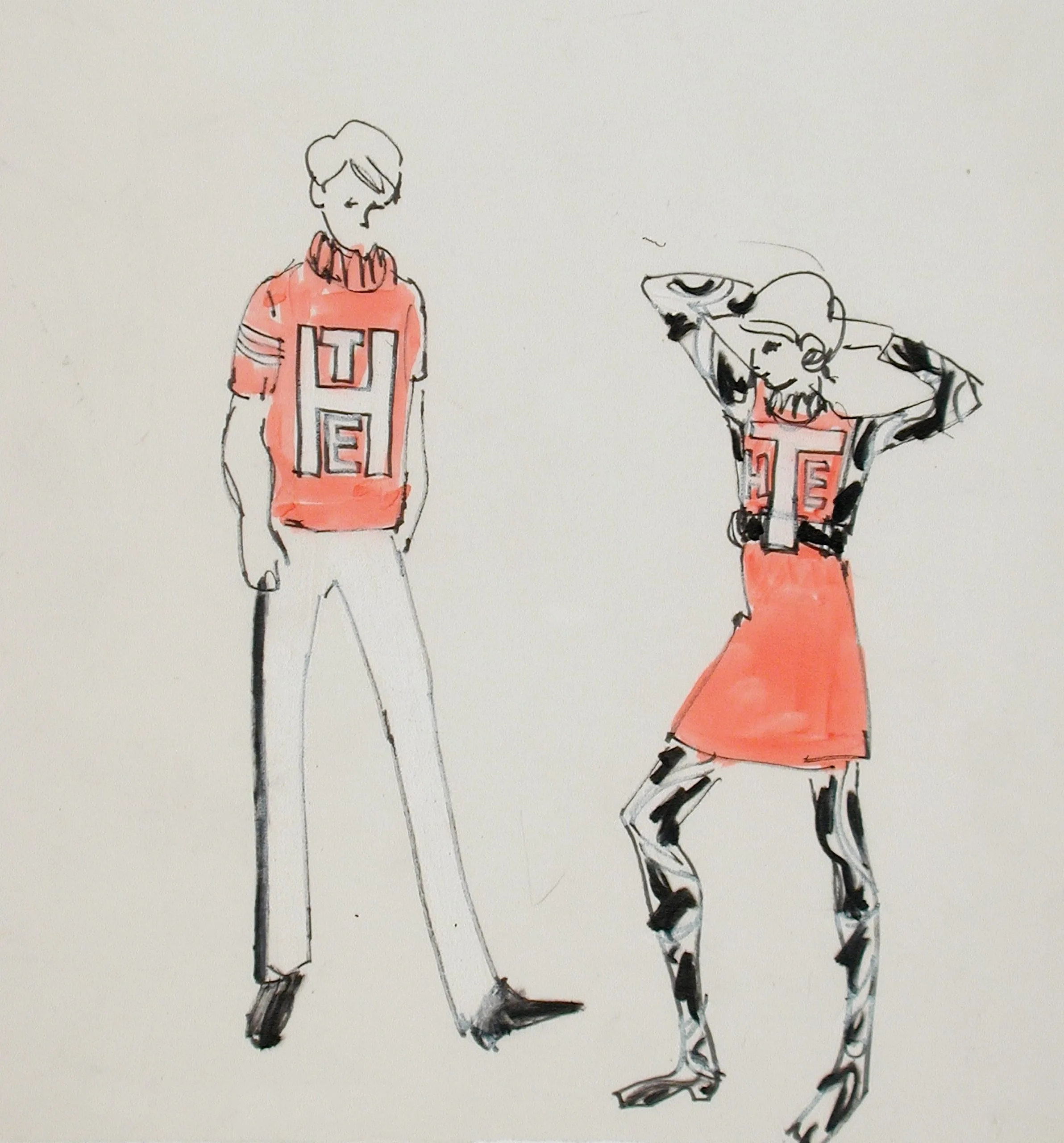 Fashion illustration in ink and coral-red wash showing two figures wearing matching lettered tops — one facing forward in wide-leg trousers, one facing away in a miniskirt and spotted boots