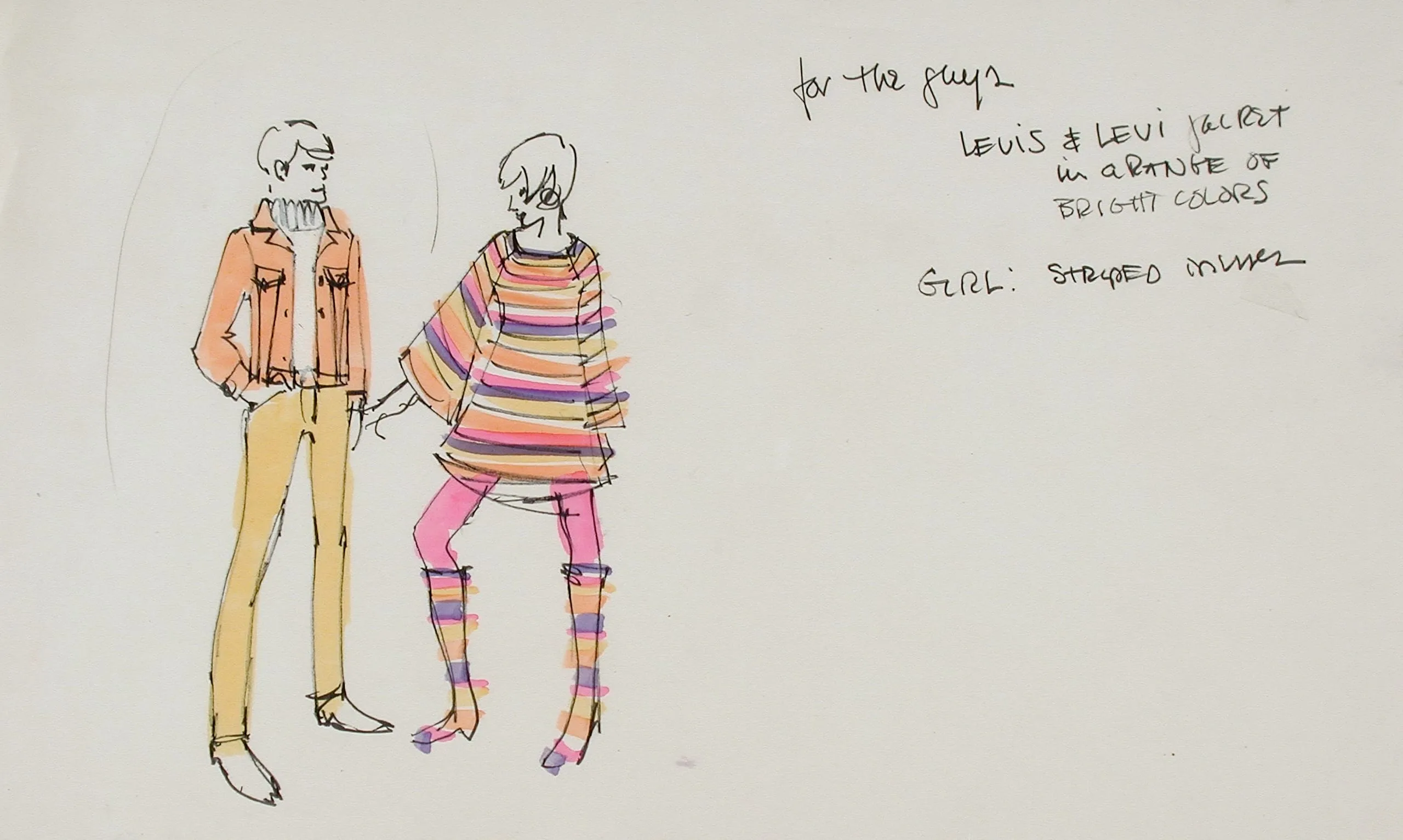 Fashion illustration in ink and marker on cream paper, two figures wearing colorful 1960s-style outfits — a denim jacket and wide-striped poncho — with handwritten design notes