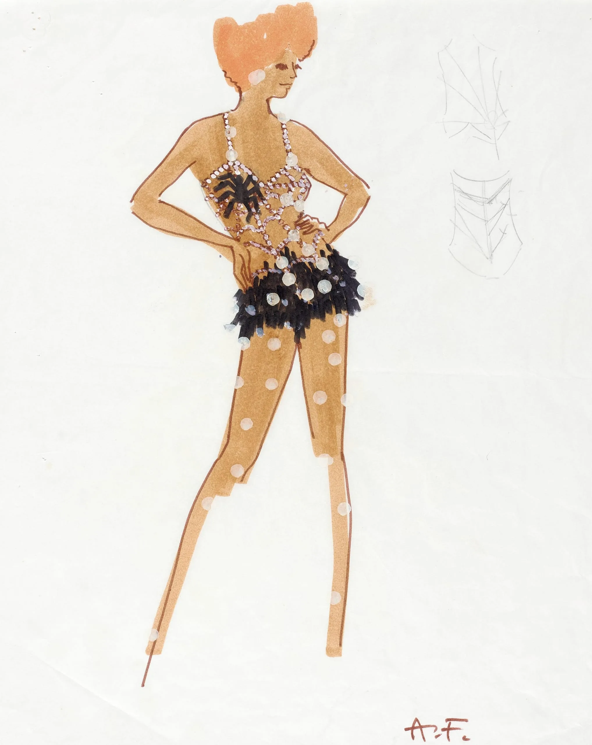 Costume design drawing in brown ink wash and watercolor, full-length figure in a jeweled halter bodysuit and feathered skirt with a smaller graphite sketch to the right