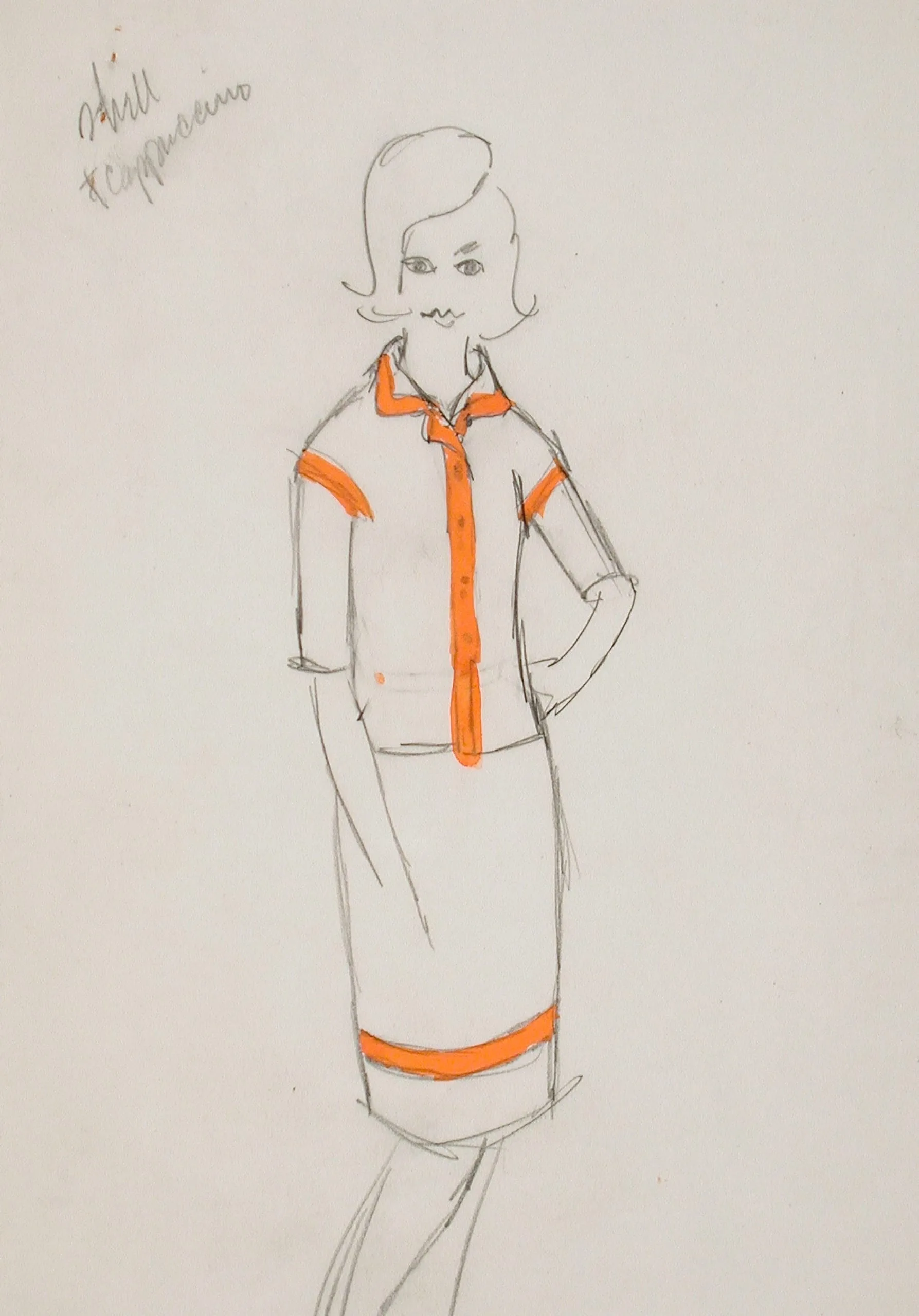 Fashion illustration in graphite and orange marker on white paper, full-length female figure in a trimmed jacket and straight skirt with handwritten annotation in upper left