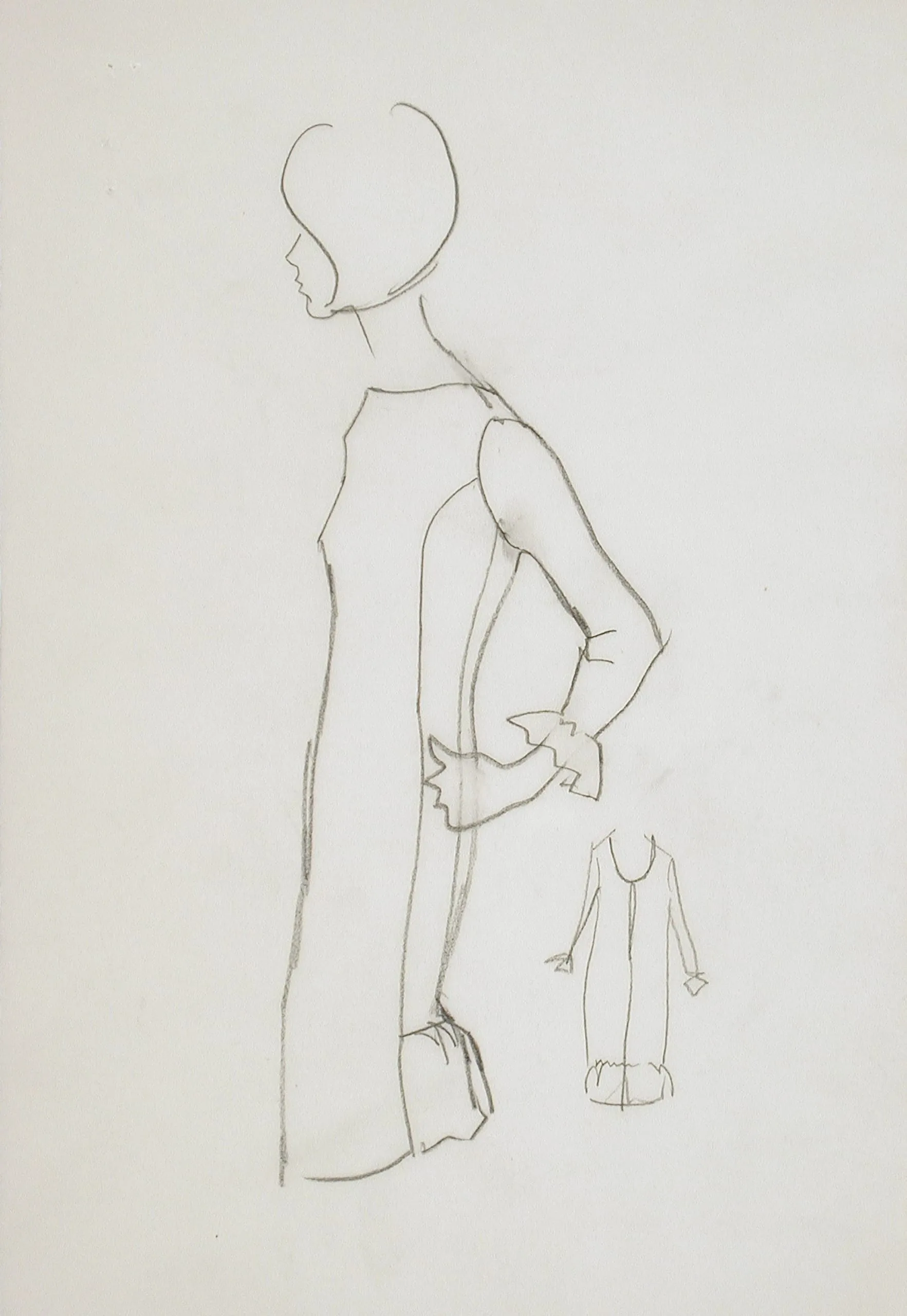 Pencil drawing on off-white paper, loose fashion sketch of a standing figure in profile wearing a long dress, with a smaller flat garment study below right