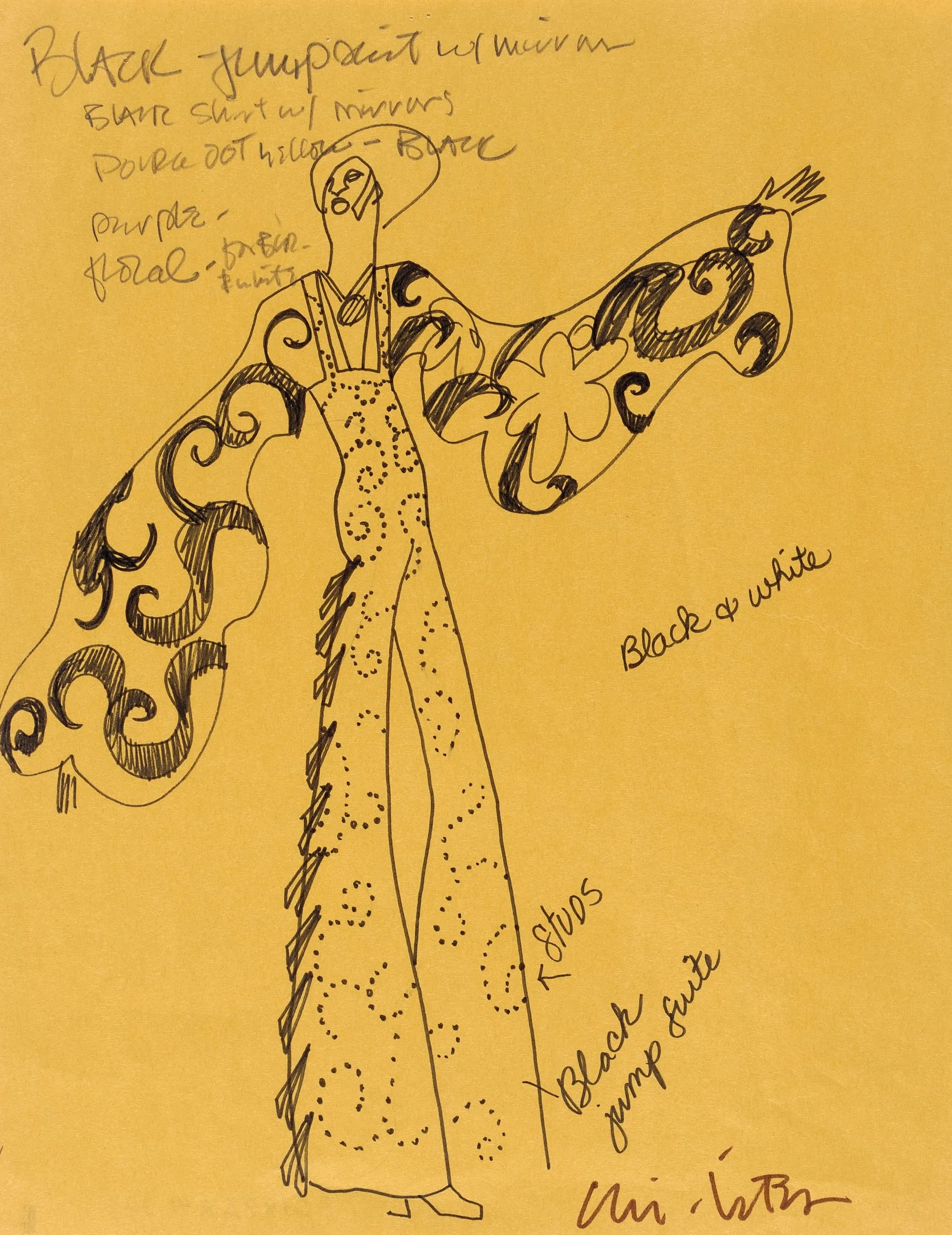 Black ink costume design sketch on goldenrod paper showing a standing figure in a polka-dot jumpsuit with a wide, scroll-and-floral-patterned cape, with handwritten annotations