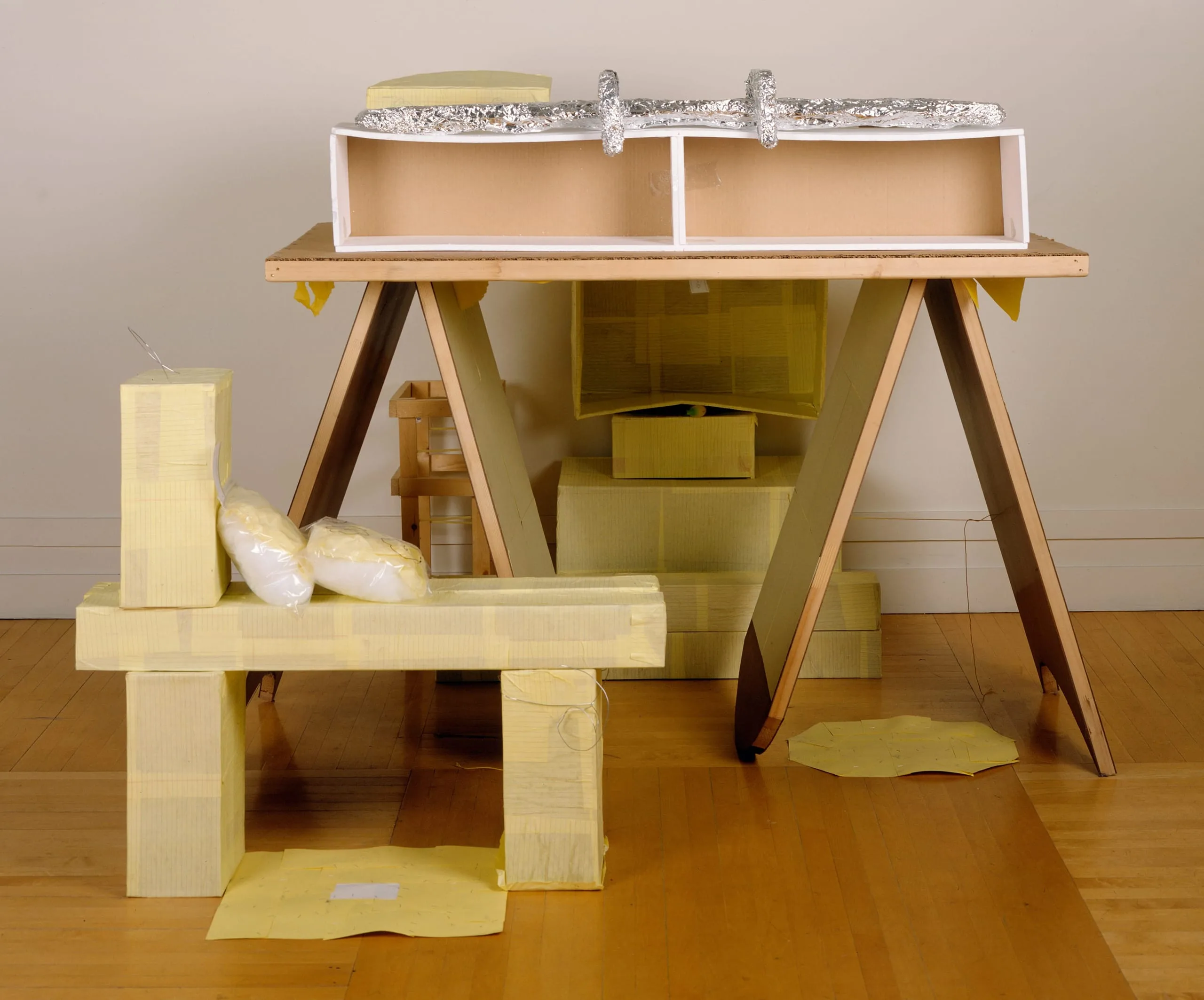 - #12, Aluminum foil truck bumper, horizontal model shelf (Judd), refinished milk crate, contractor door designer sawhorses (2), refinished blocks, chaise lounge with wire headboard, 2 carpets, refinished console cabinet, end table stand with straw detail, plastic support banana, pillows from 'Swedish Erotica & Fiero Parts'