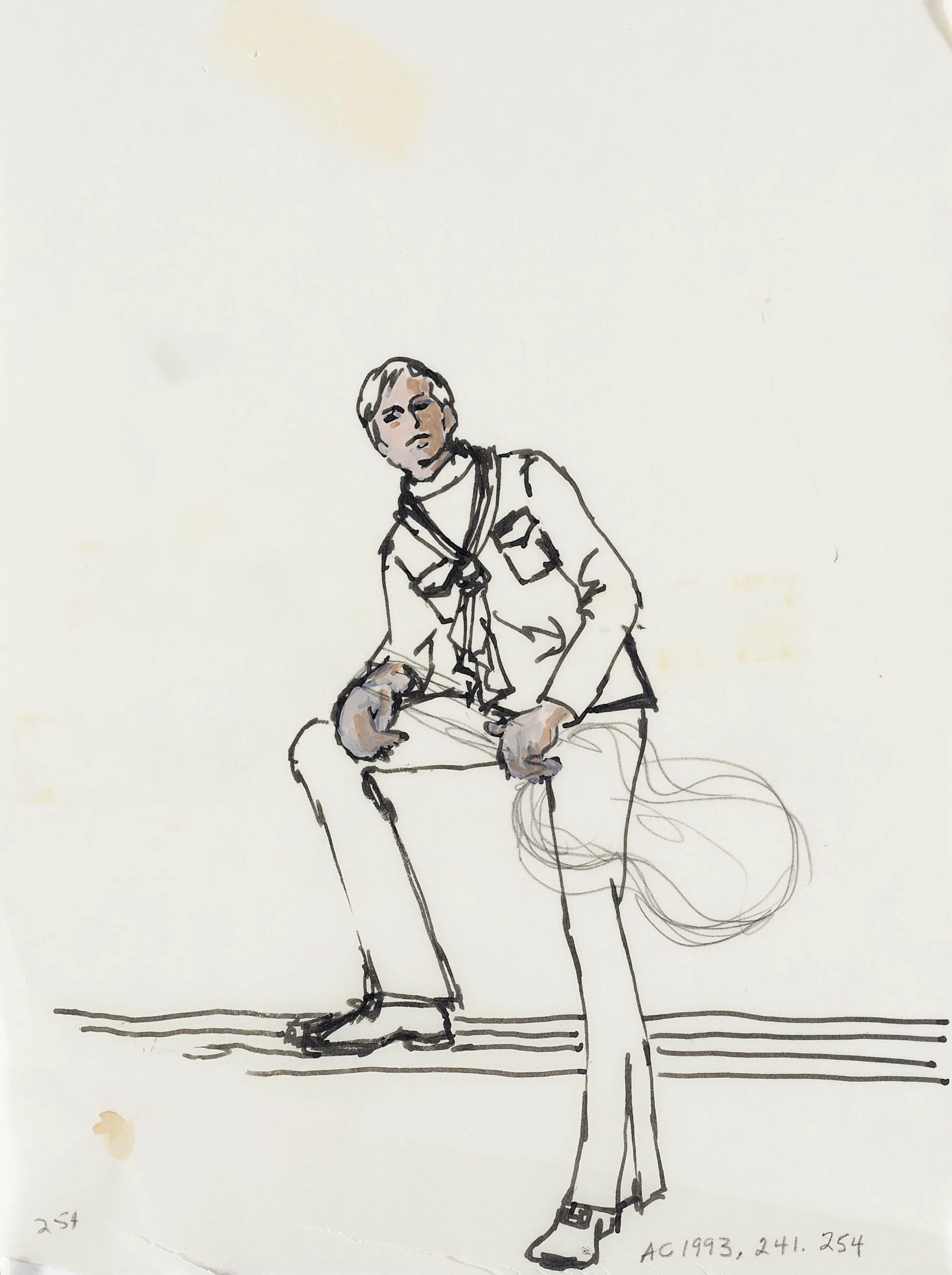 Gestural ink and watercolor drawing of a seated man in a light jacket and pale trousers, with loose brushwork and minimal detail on off-white paper
